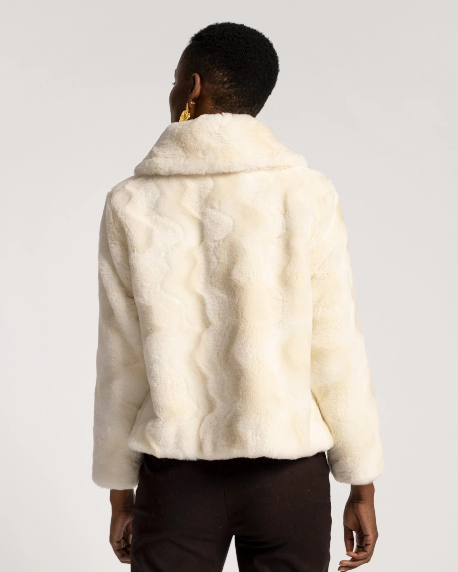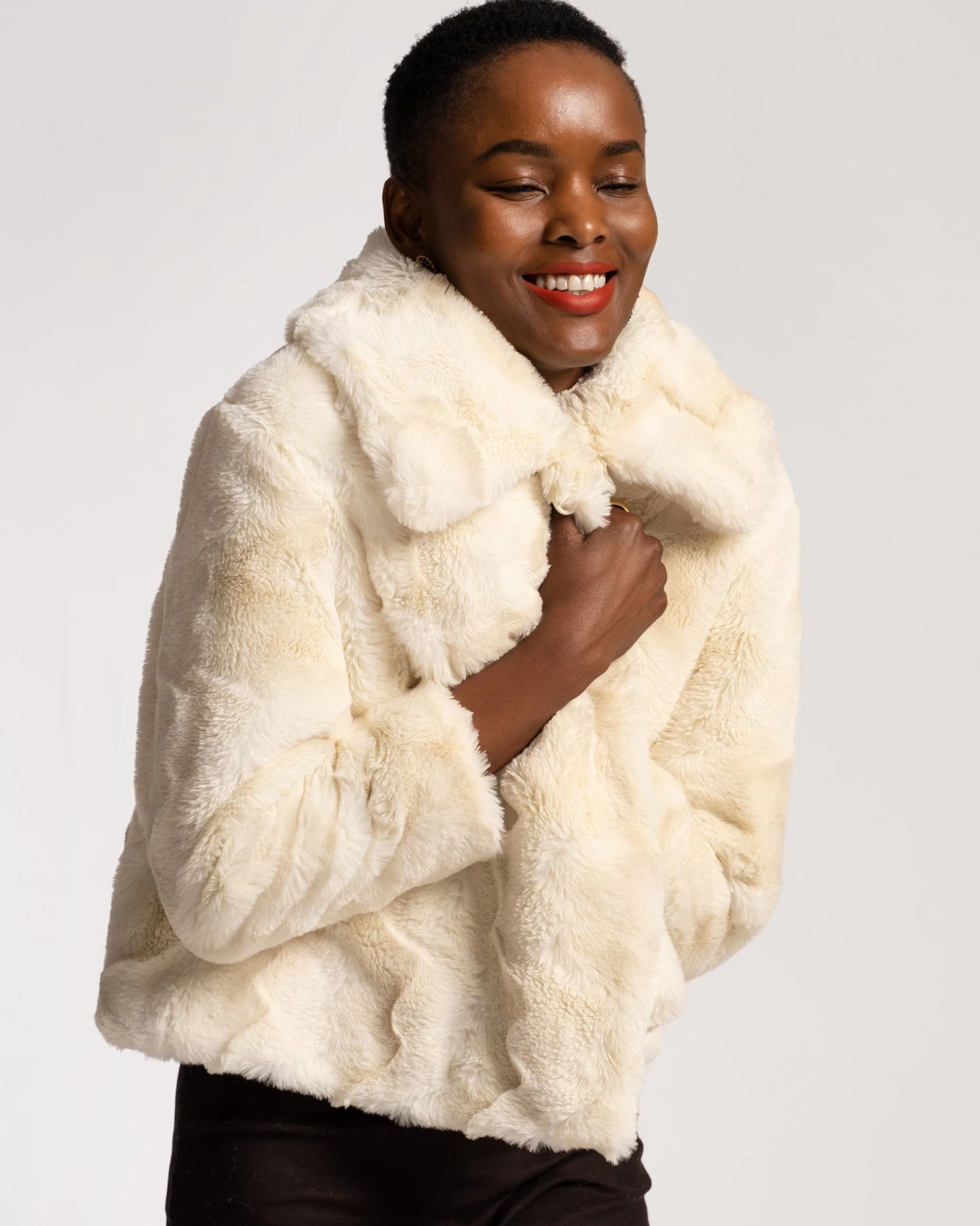 Avoid the chill and embrace the charm of snowfall this season by reaching for the Babe Jacket. Our take on the timeless fur coat design uses faux fur in winter whites, fitted with an open collar and cropped at the waist. Deliciously soft and perfect for layering, this statement piece can make any outfit look inspired.