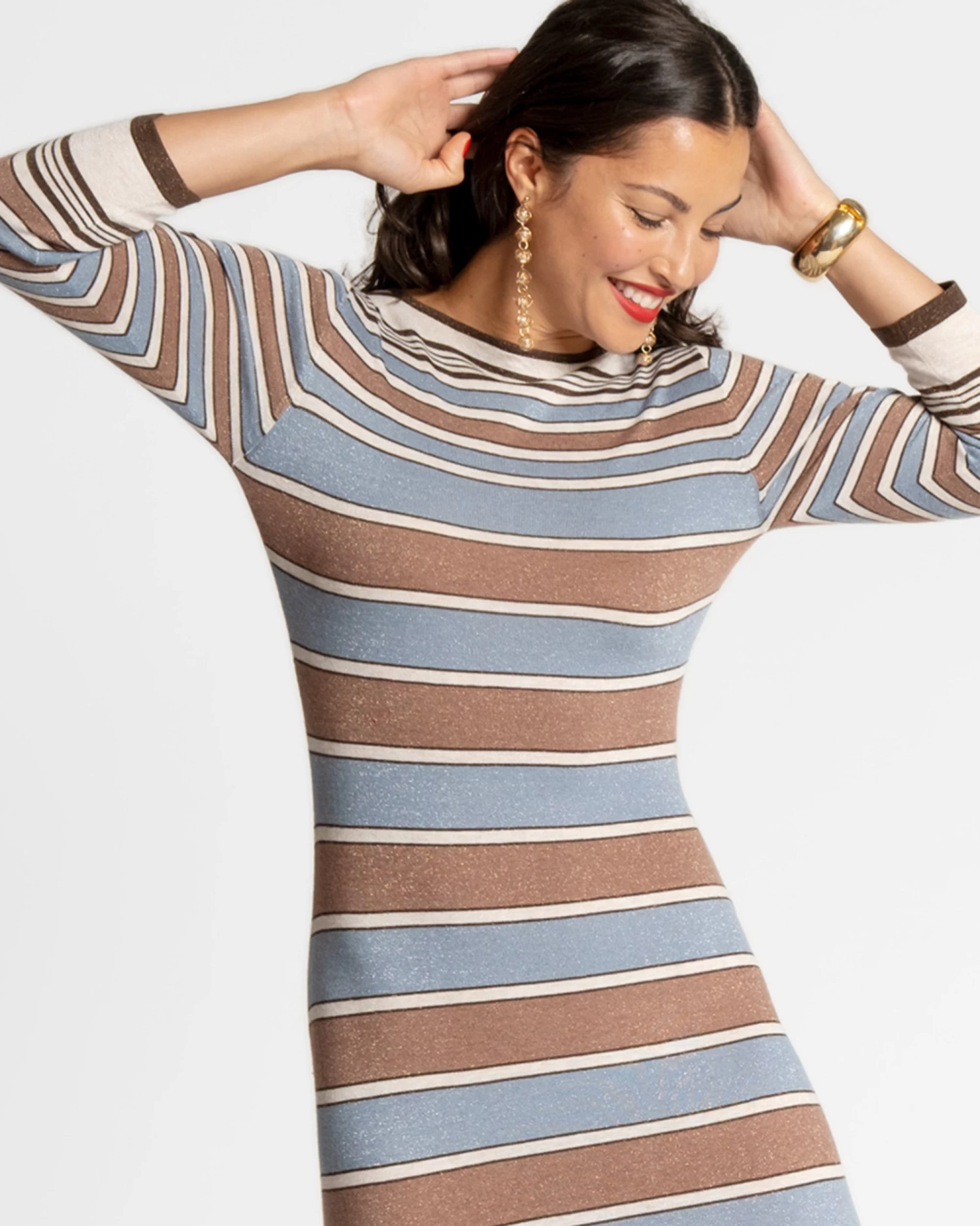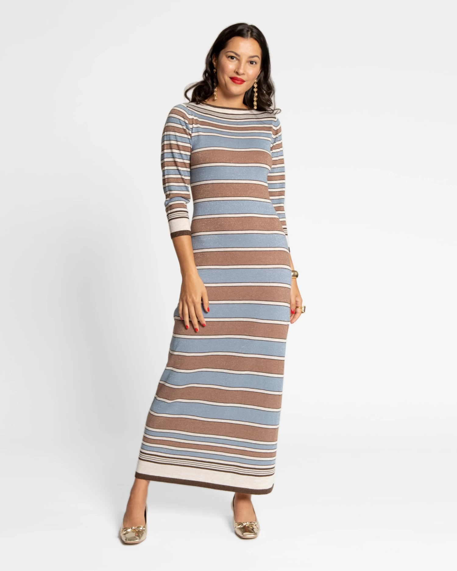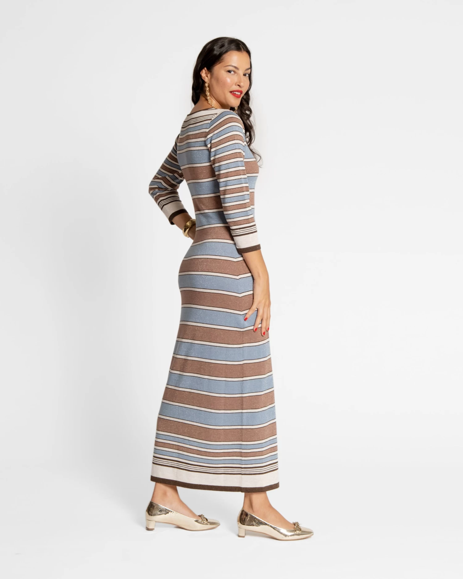 Introducing the Bianca Maxi Dress woven in custom FV stripes. This flattering dress is woven with a light lurex thread for a fun sheen! A more body conscious silhouette than our Colorblock Maxi, this style is sure to make an entrance at every event.