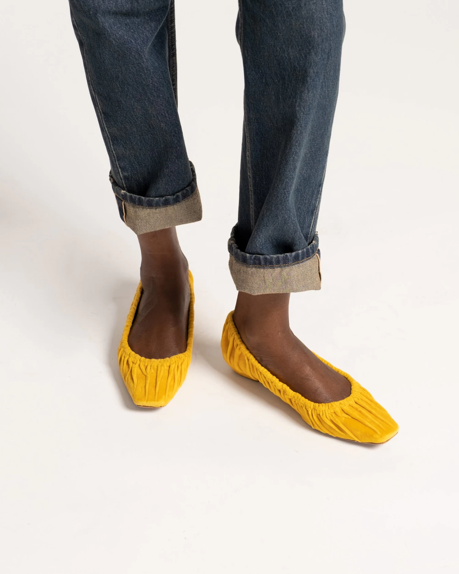 Ruched velvet flat. Leather sole.