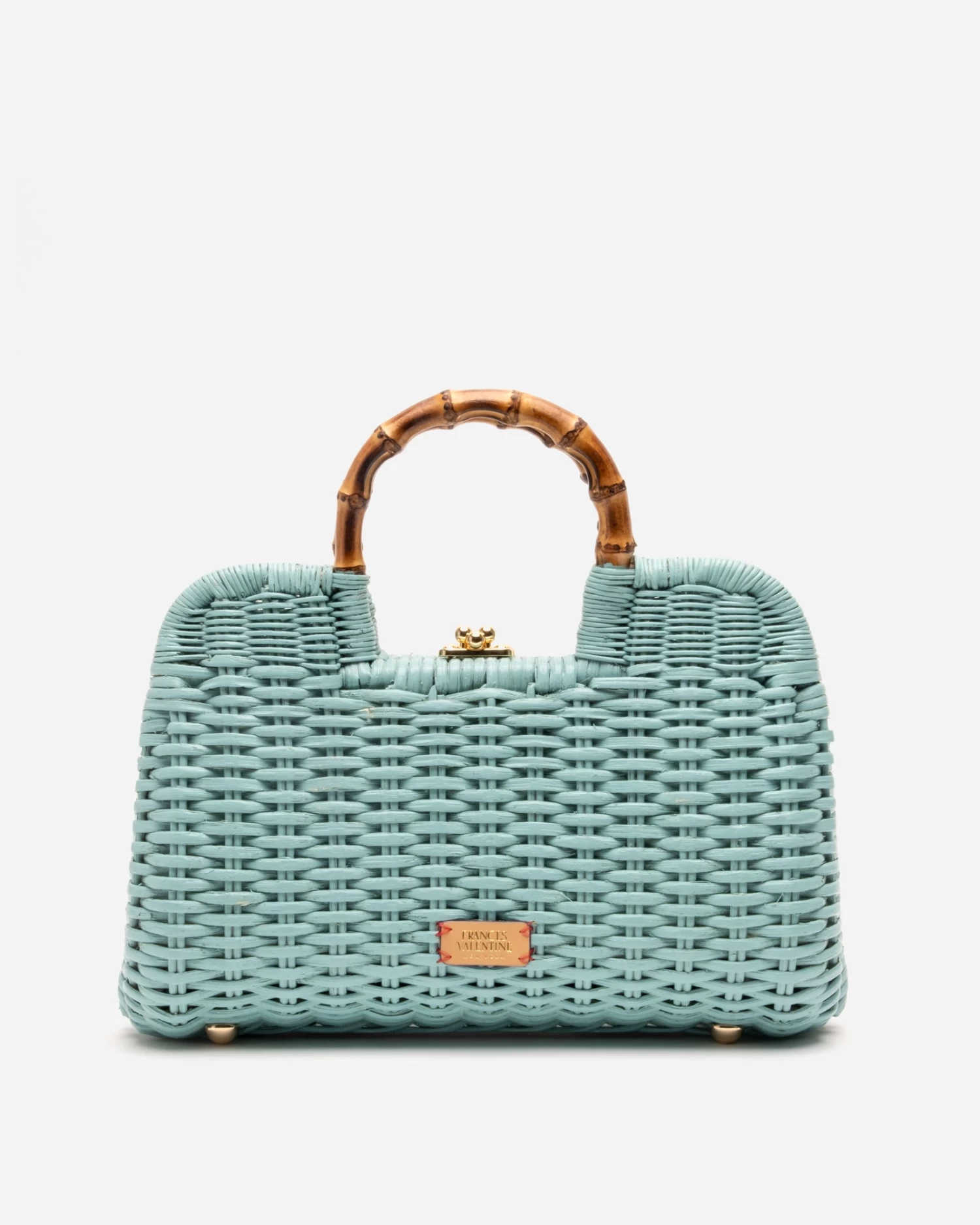 Hand woven painted wicker. Wooden bamboo handle. Metal ball & pin closure. Floral cotton twill lining. Interior zippered pocket. Metal feet.