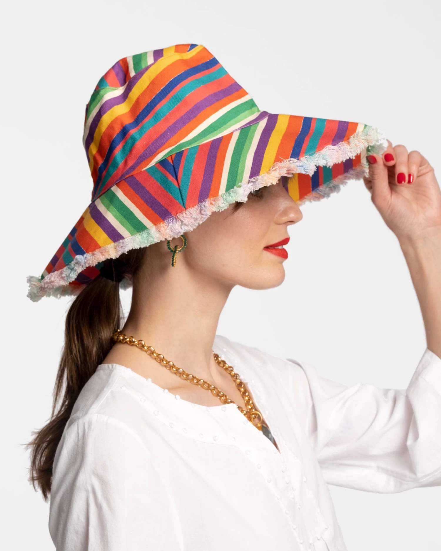 Beat the sun in style with the Canvas Fringe Sunhat featuring our Candy Stripe print. Easy to pack and easy to wear this cotton canvas sunhat is a sunny day staple. Add a pop of color and have fun with your accessories!