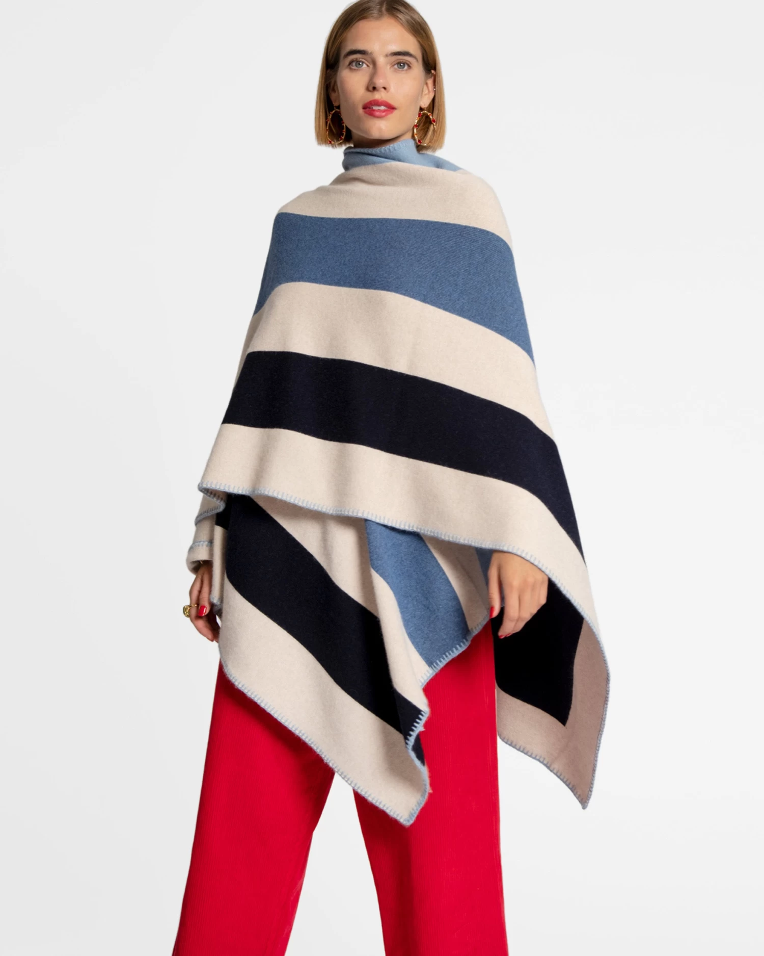 Our Classic Colorblock Wrap receives an update featuring bold mitered stripes. This piece is perfect for tossing over almost anything creating a chic look, especially during transitional months. Its styling versatility allows for numerous looks. This soft and cosy wrap feels like the warm hug we all need right now.