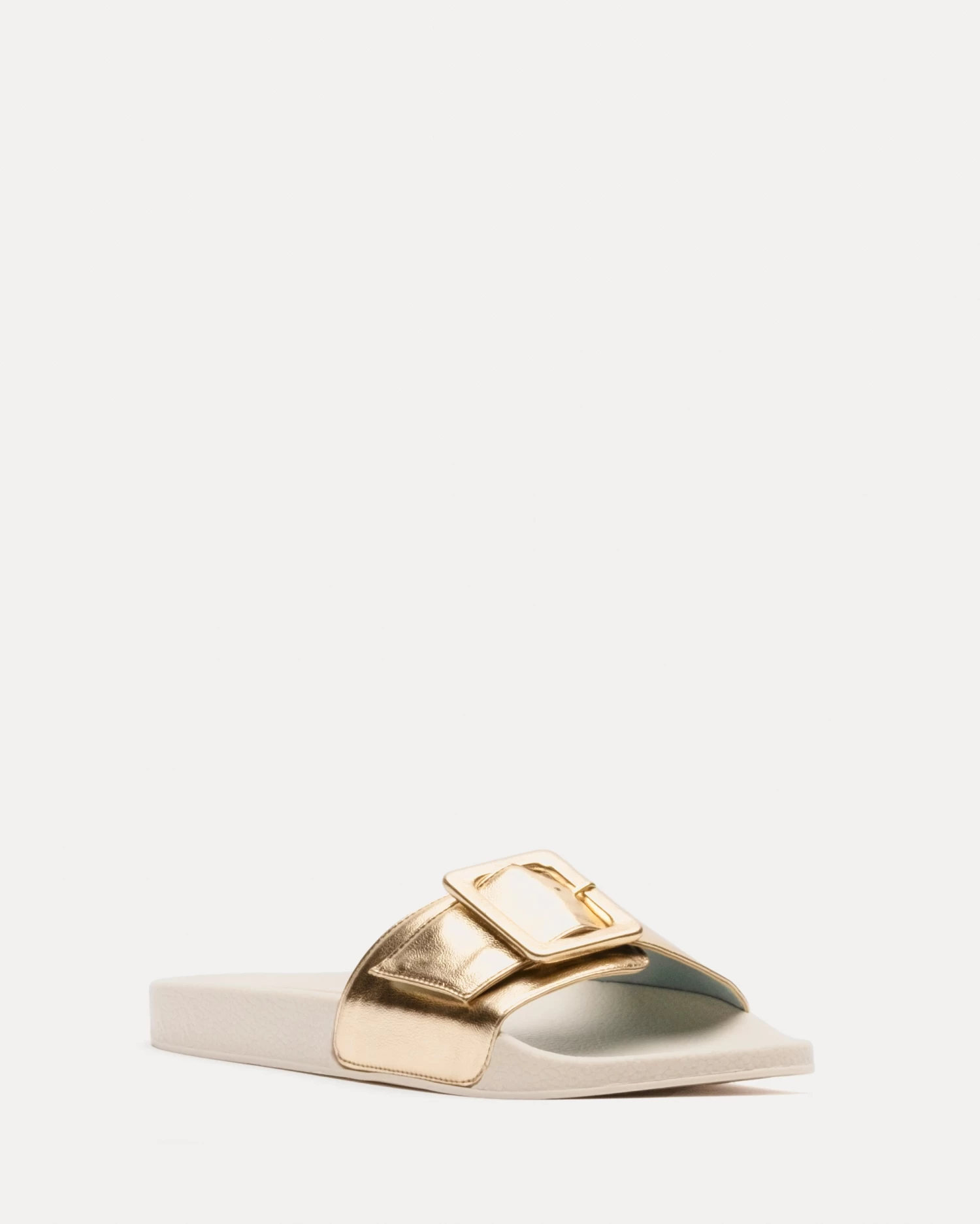 Slide into the sunny season with Daisy. A classic slip-on slide with cushy leather soles and a bold buckled strap, Daisy has a water-proof design for comfortable and stylish wear at the pool or beach. Available in bright color variations, coordinate this shoe with matching accessories or garments for vibrant warm-weather style.