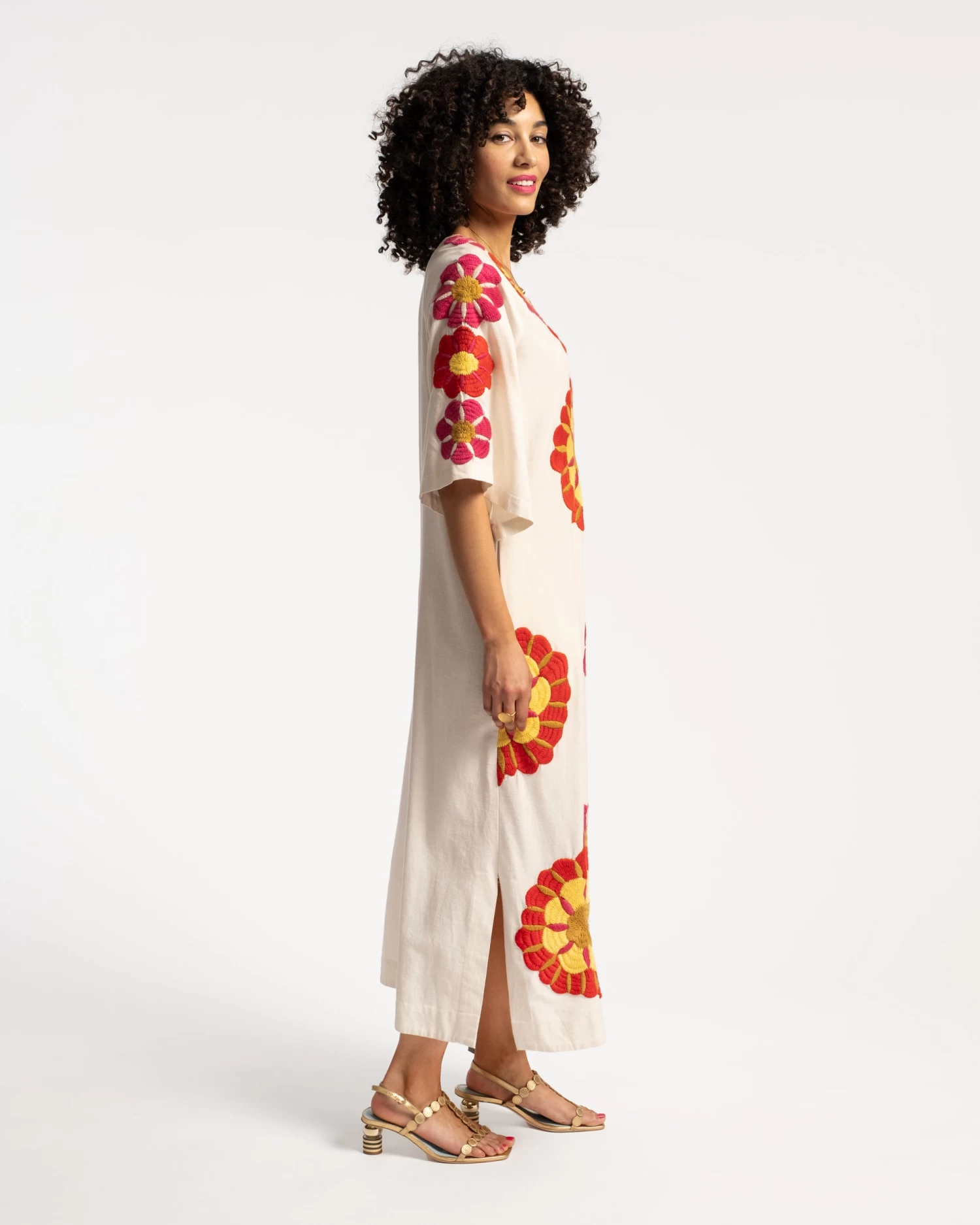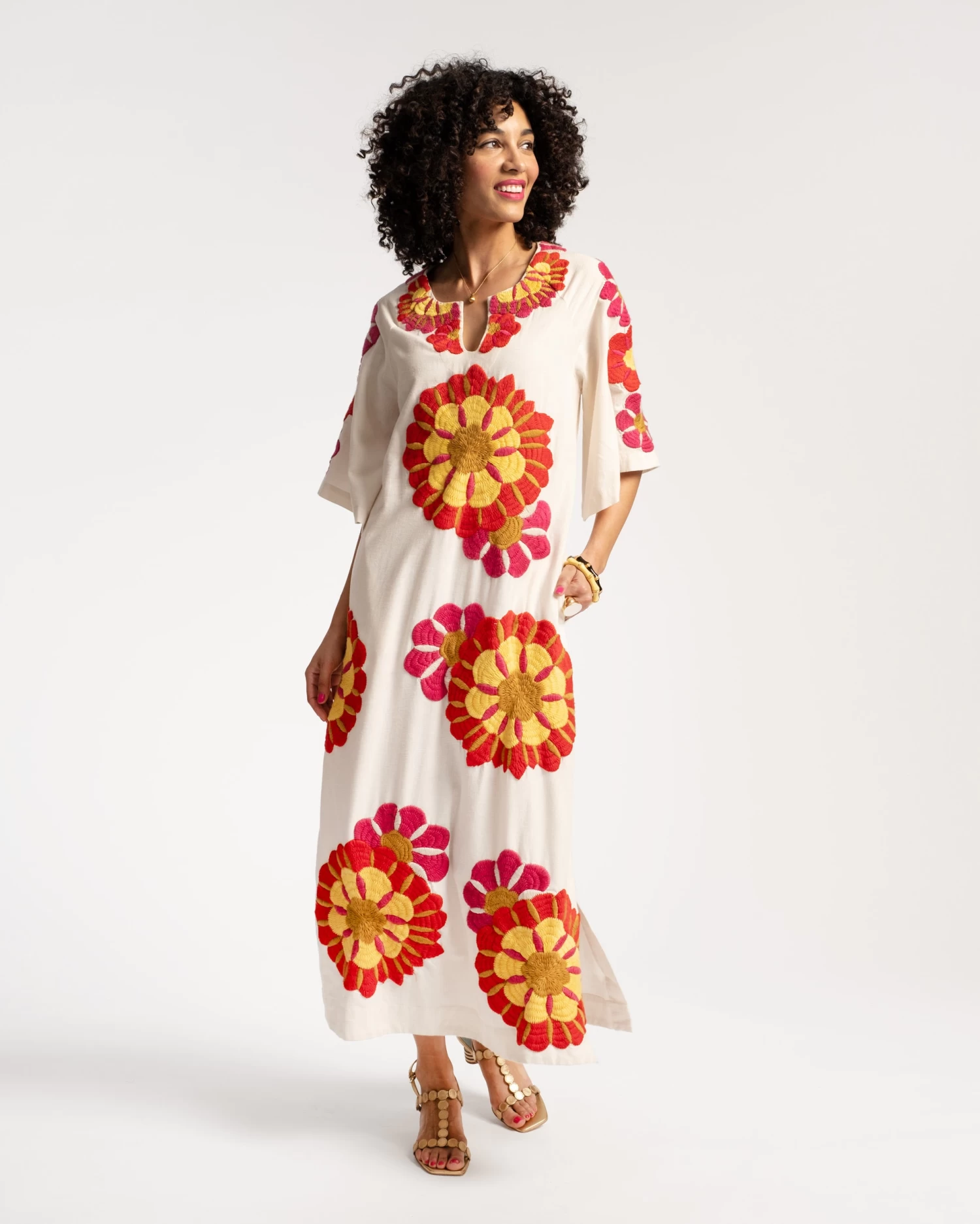 What a delight! The Delightful Caftan is a medium-weight maxi dress with wide sleeves, pockets, and our signature FV neckline. A roomy dress design, adorned with bold embroidered florals, this piece is ideal for chilly summer evenings or temperate garden parties.
