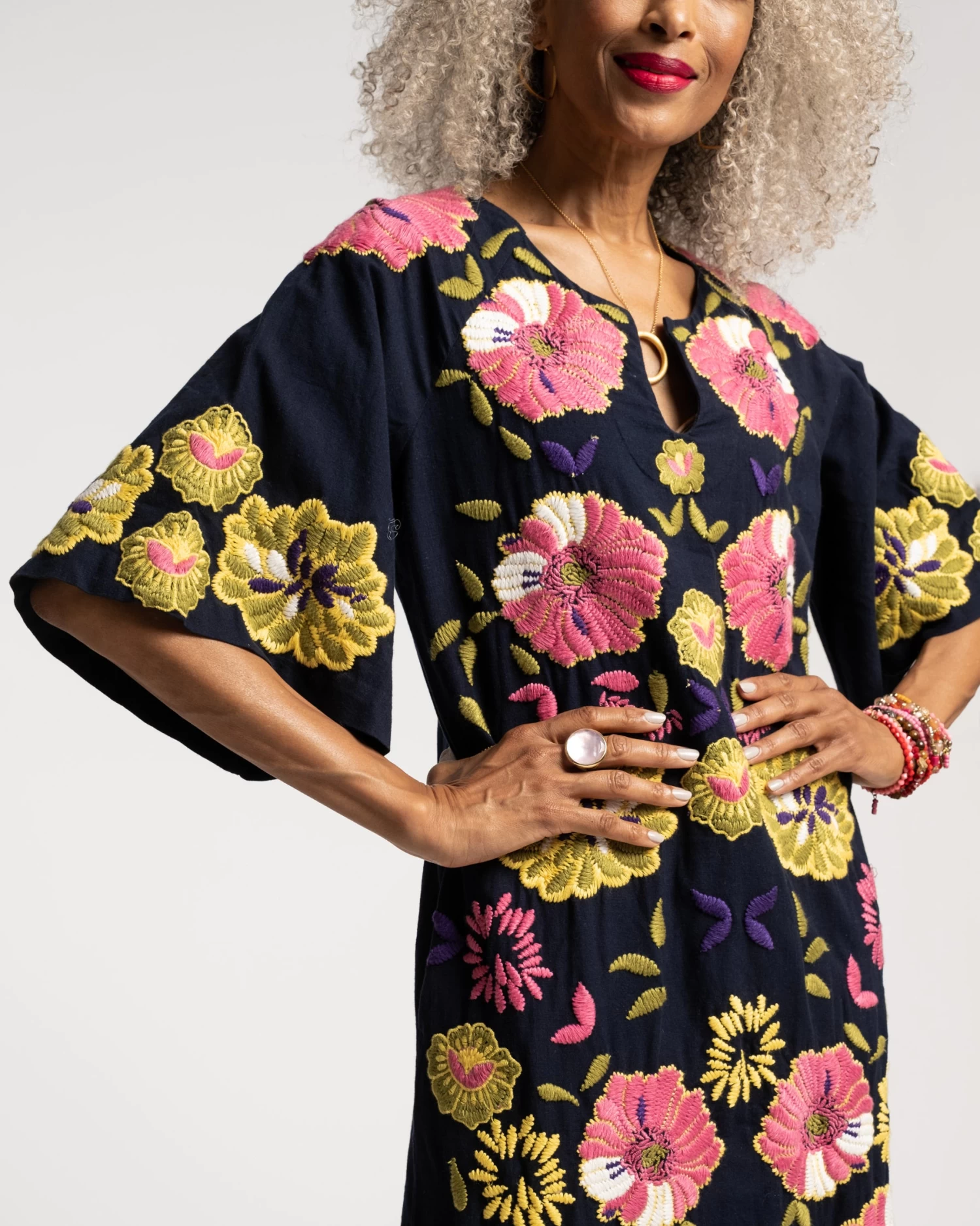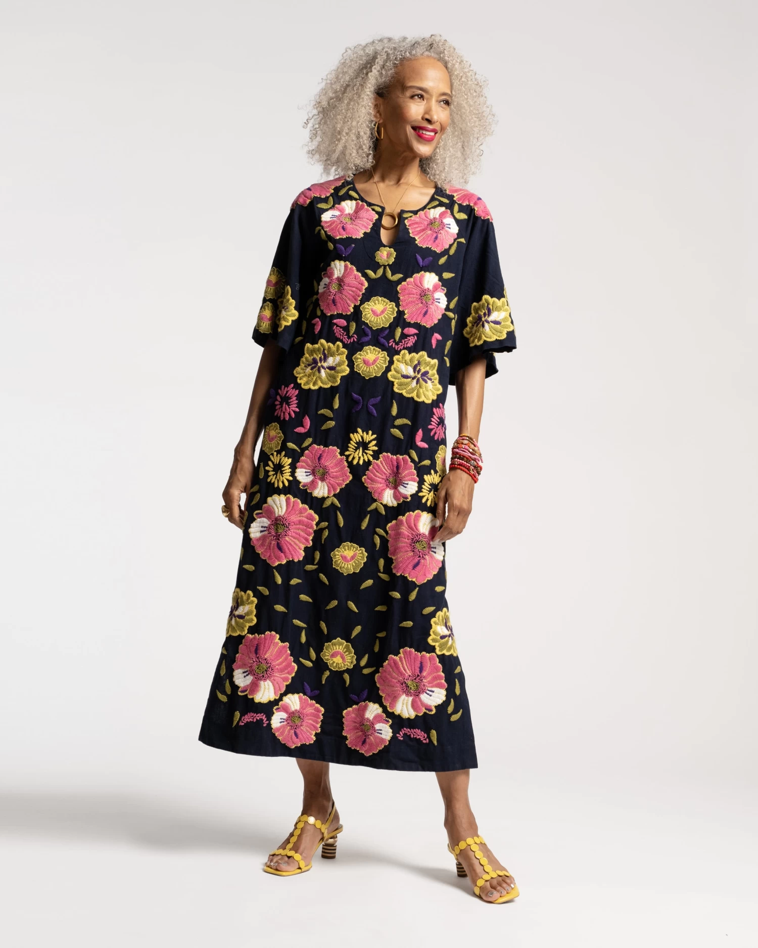 The Dreamy Caftan is our signature maxi with roomy fit – designed with side slits, pockets, and medium-weight cotton linen. Featuring custom embroidery details and bold patterned prints, this caftan brings both comfort and style to your wardrobe throughout the seasons.