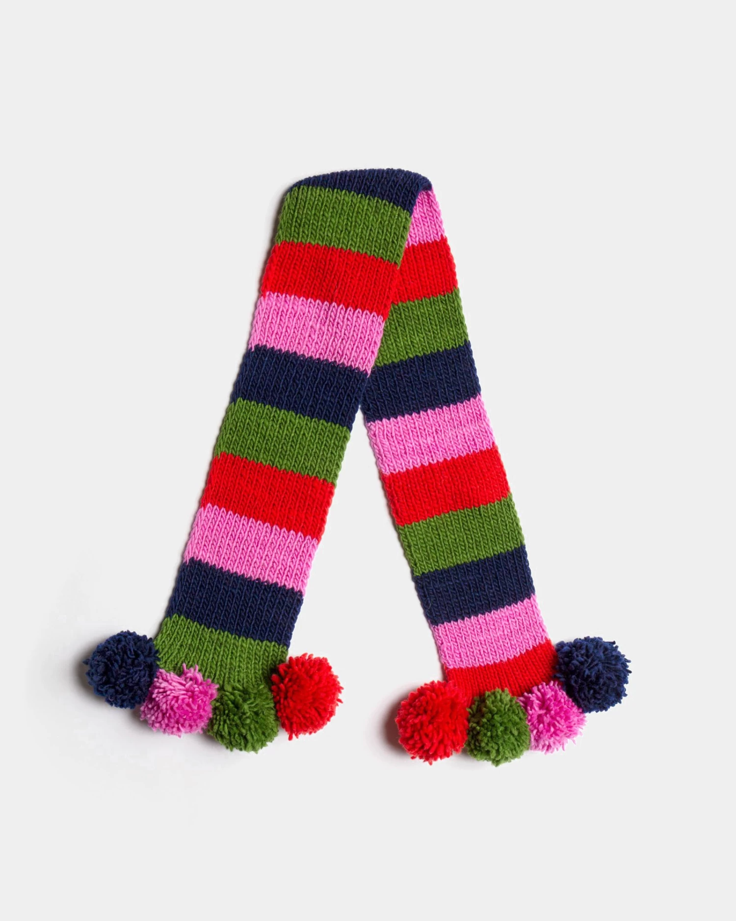 We love our Festival Stripe Scarf! This hand knit stripe scarf is adorned with oversized pompoms, the perfect fun accessory.