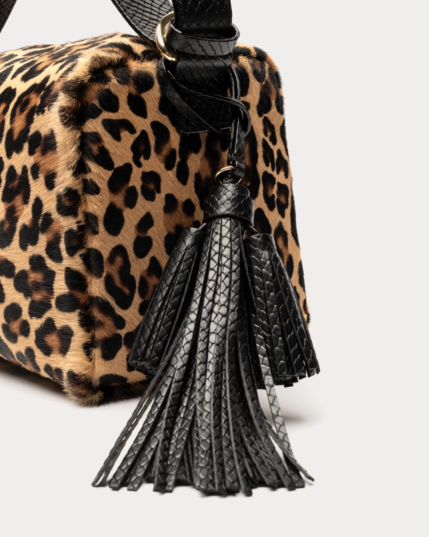 An FV favorite, the Flannery Bag features a leopard-printed haircalf design with snake-embossed leather trim and a matching tassel. This slouchy box bag has a zip closure, internal phone pocket, and adjustable straps for practical everyday carrying.