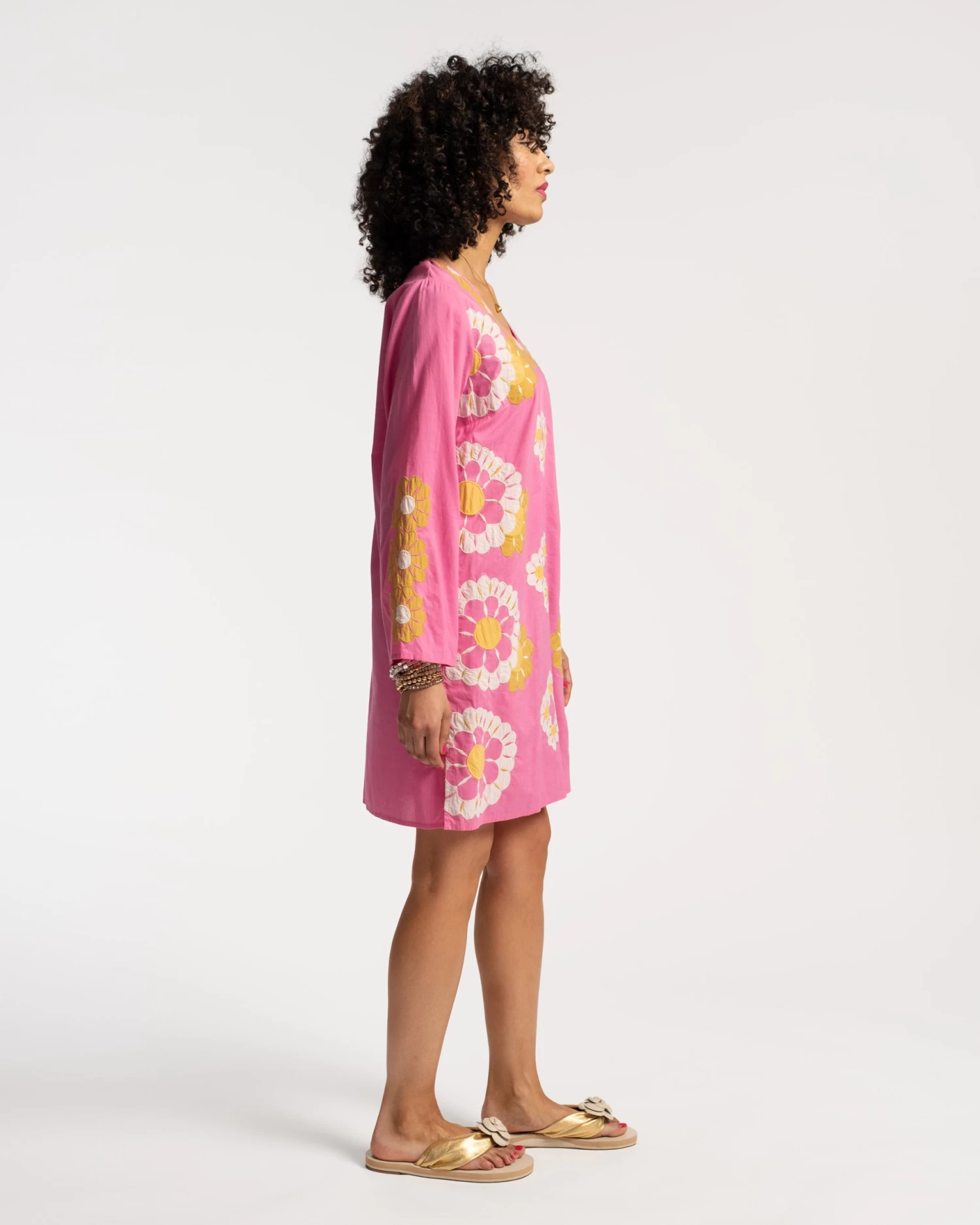 One tunic, endless outfit options. Goldie is a lightweight slip-on with a V-neck and wide long sleeves. Embellished with bright floral fabric details, this women’s tunic is as cheerful as it is versatile – beautifully styled as a coverup, top, or dress.