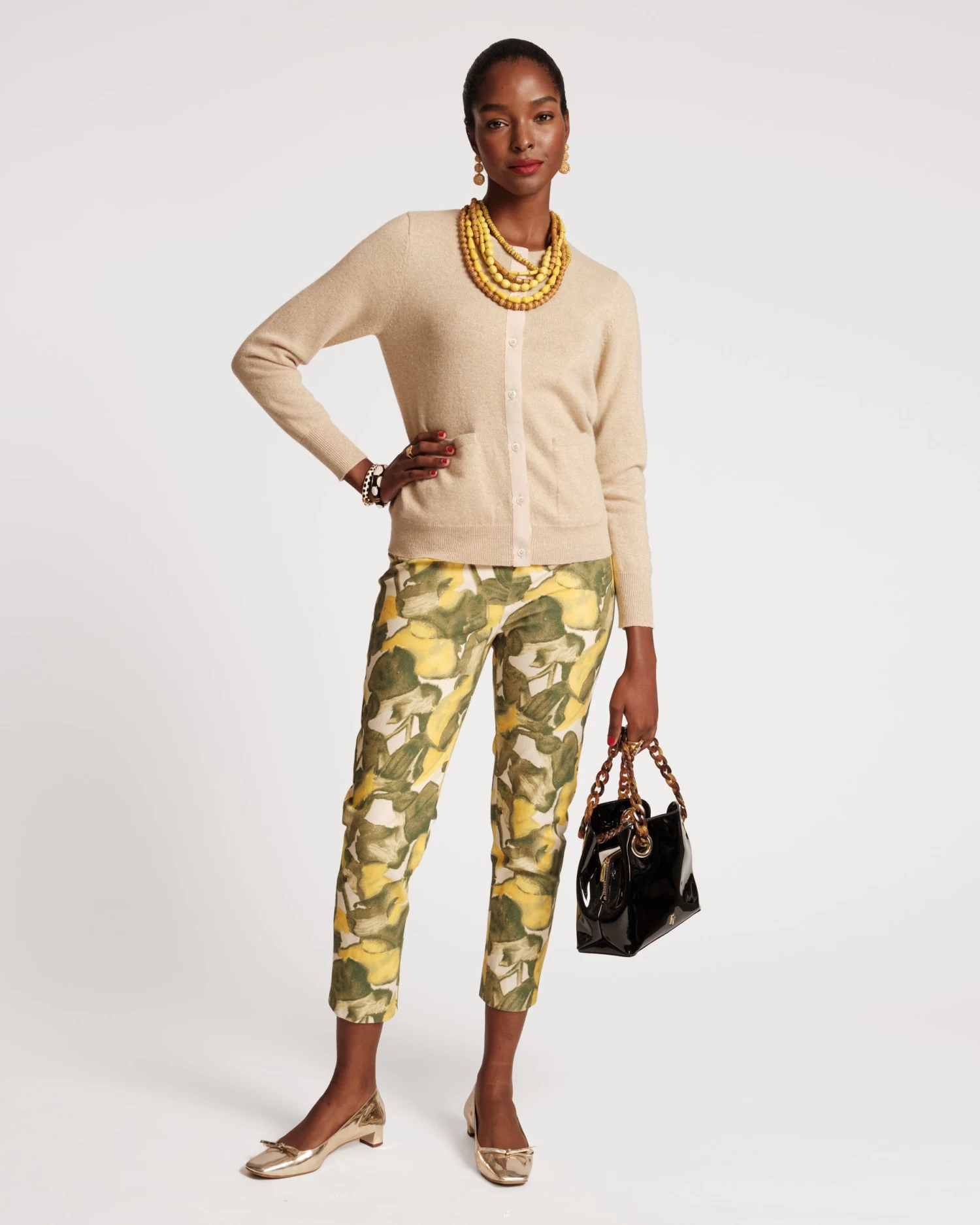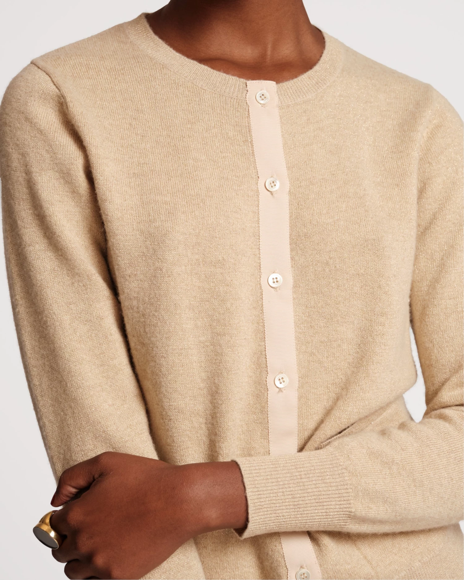 Helen is an elevated womenโs cardigan that is perfect for any ocassion. This wool-cashmere design with a shimmery knit features two front pockets, delicate shell buttons, and a grosgrain ribbon placket โ turning everyday sweater looks into something more special.