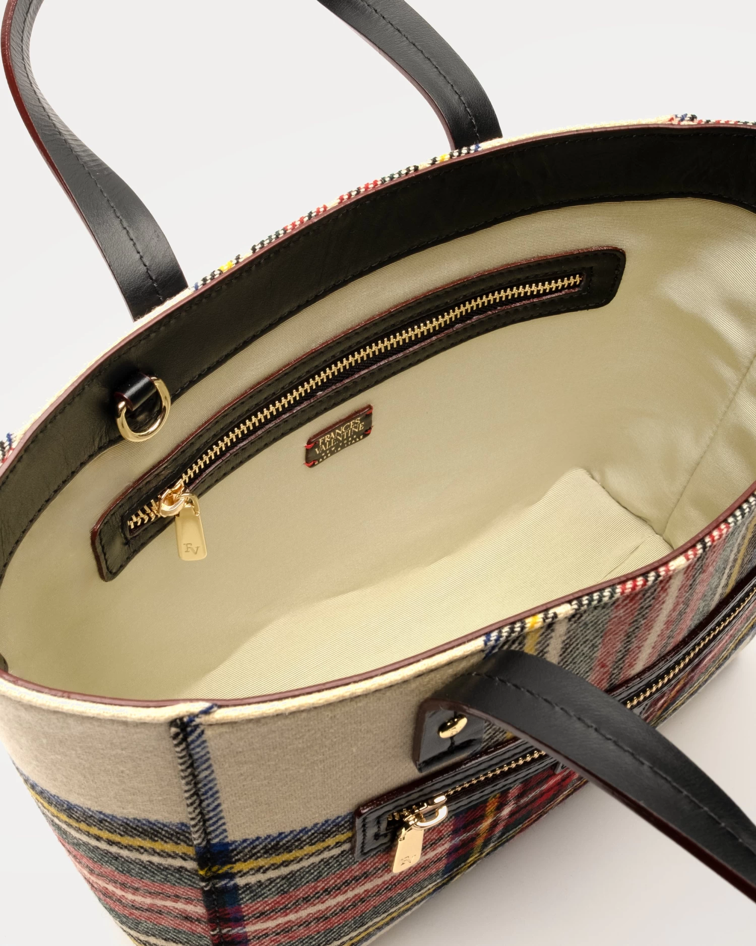 Brushed wool tote. Leather bottom with feet. Interior and exterior zippered pockets. Adjustable and detachable crossbody strap. Brushed cotton twill lining.