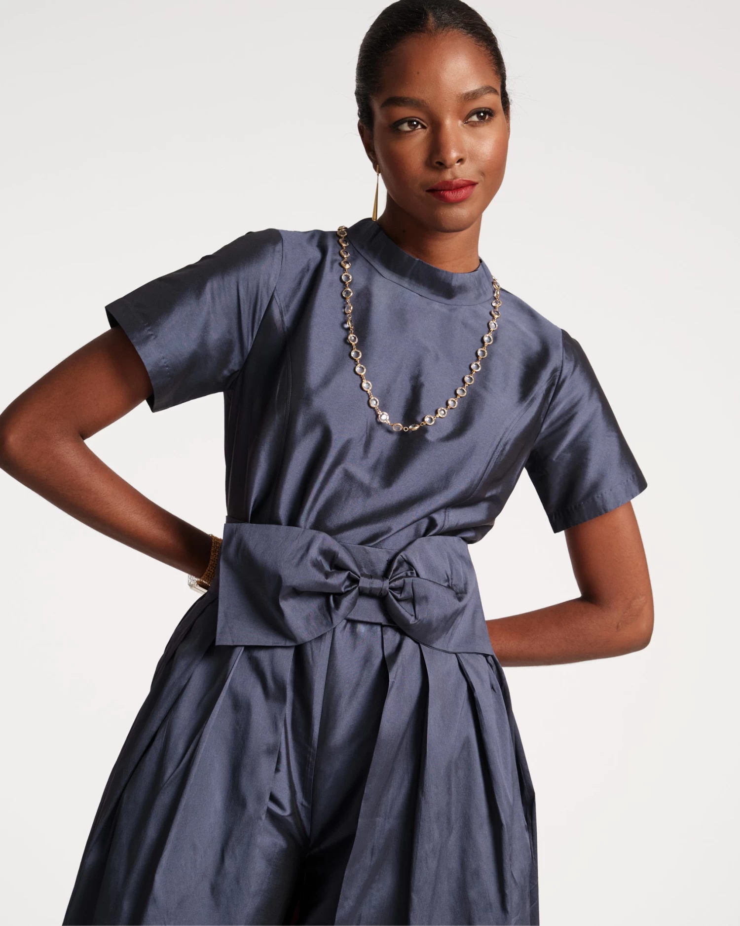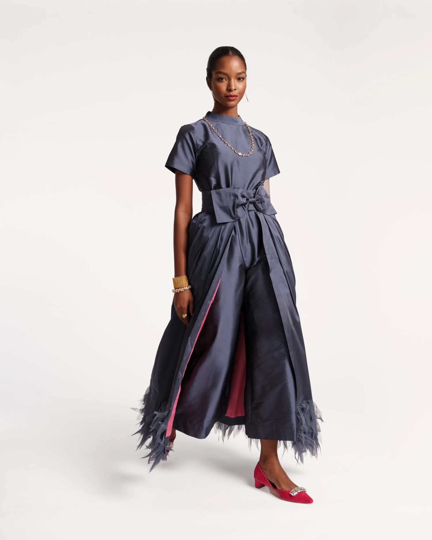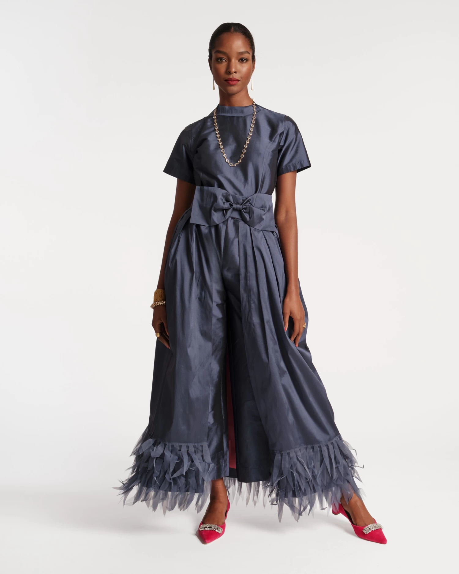 Inspired by our Audrey Jumpsuit, Jody is a statement one piece with a belted maxi skirt attachment, standing collar, and fitted short sleeves. This fun, formal design is detailed with organza feather hems and a bow tie waist, suitable for galas or holiday parties. Jazz up your women’s formalwear with FV’s women’s accessories and finishing touches.