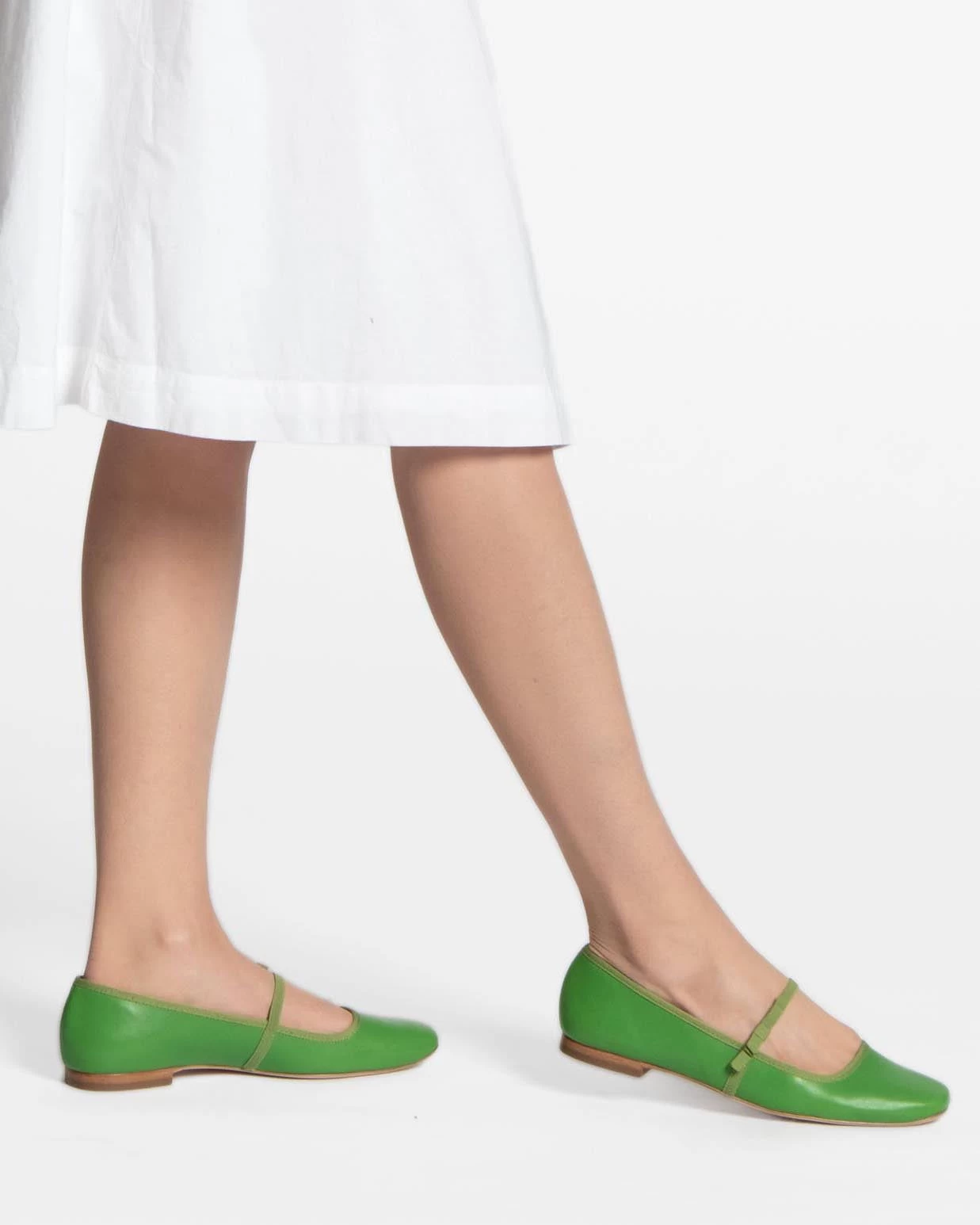 Calfskin leather with elastic bow strap. Squared toe. Leather sole.