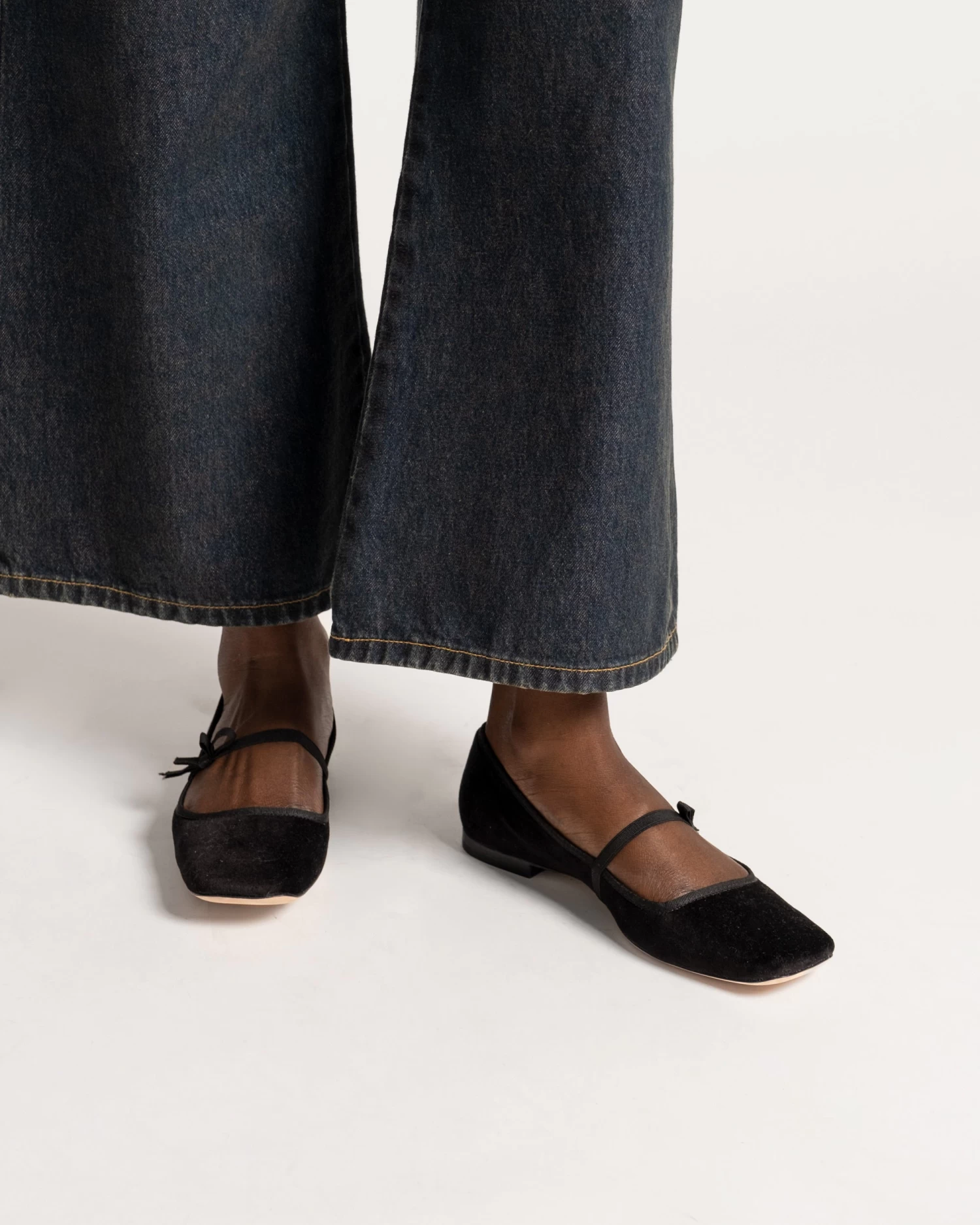 Velvet flat with elastic bow strap. Squared toe. Leather sole.