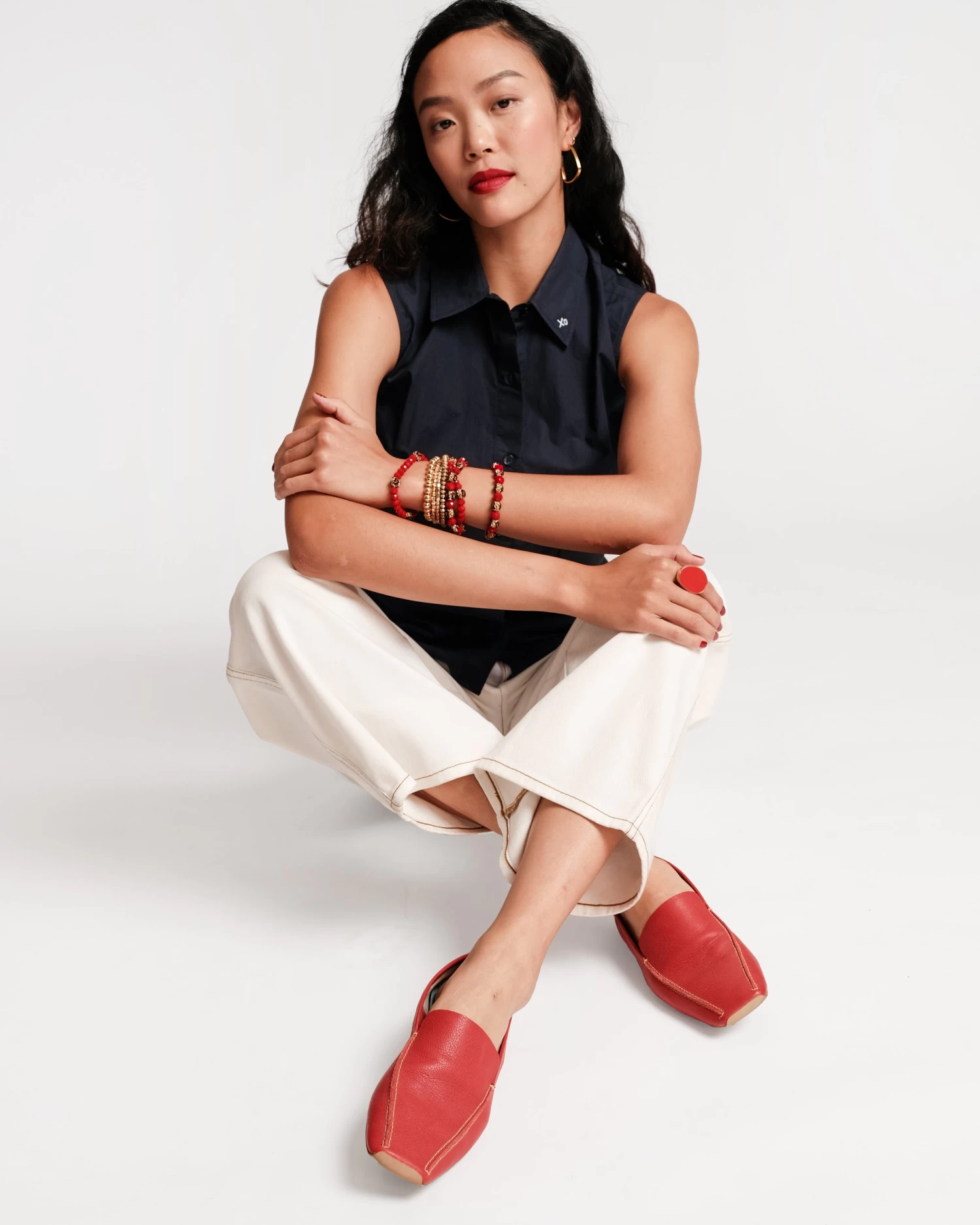 One of our wardrobe essentials, the Lizzie Pointed Collar is constructed in crisp cotton poplin and features our signature XO embroidery on the collar. This sleeveless button-down style is a great layering piece that is soft to the hand while providing structure at the same time.