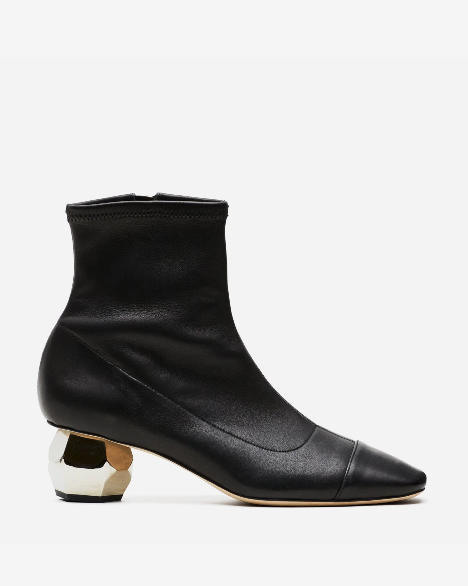 Marnie, our stretch nappa leather mid-heel bootie features our patented signature heel inspired by Buckminster Fuller’s omni-triangulated geodesic dome.