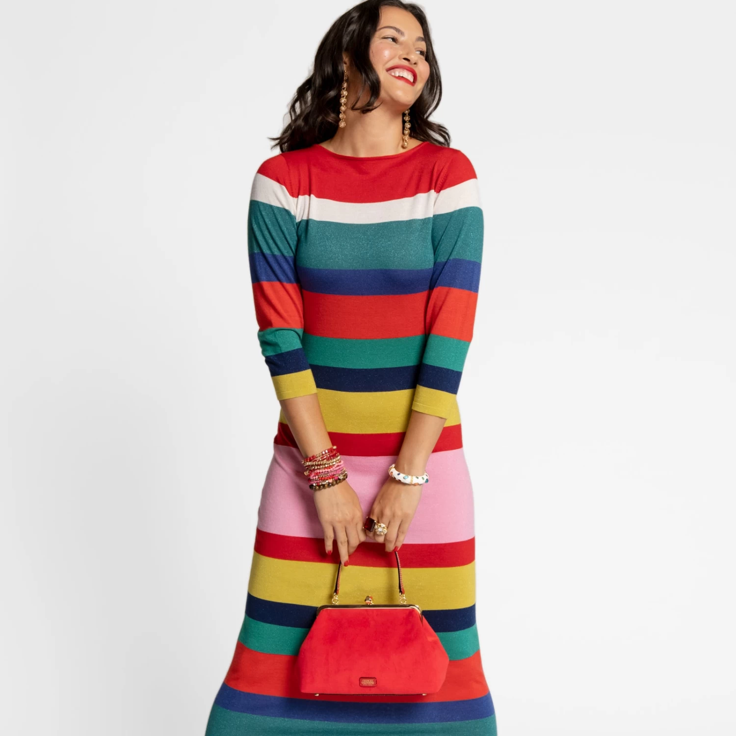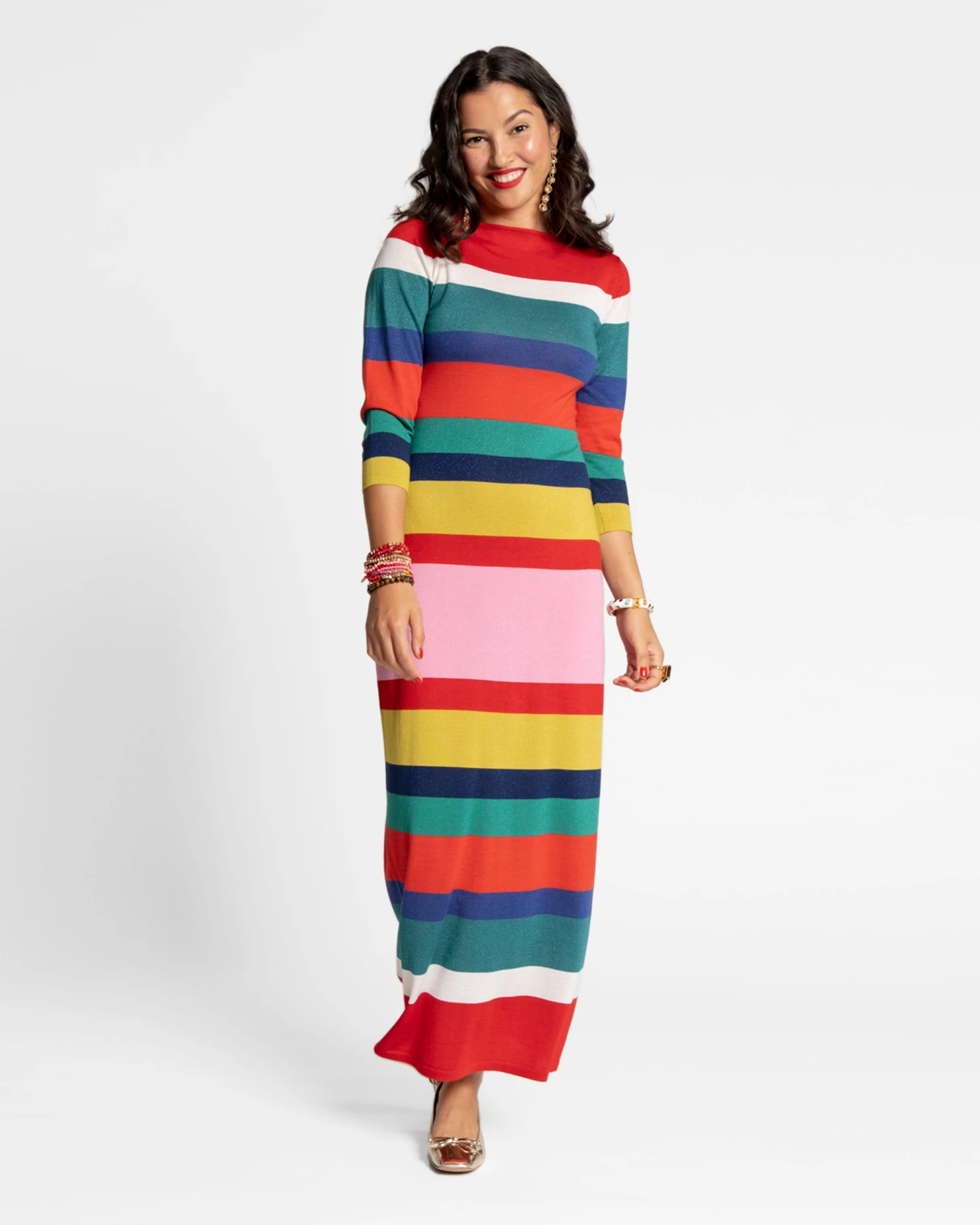 Introducing the Monaco Wool Maxi Dressย woven in custom FV stripes. This flattering dress is woven with a light lurex thread for a fun Holiday sheen! A more body conscious silhouette than our Colorblock Maxi, this style is sure to make an entrance at every Holiday party.