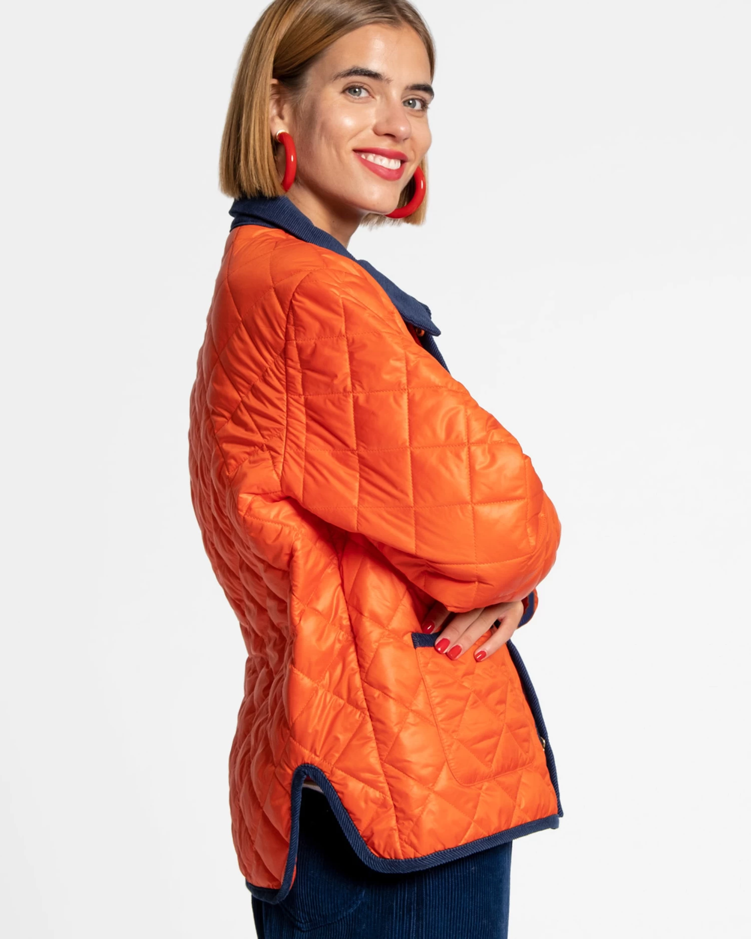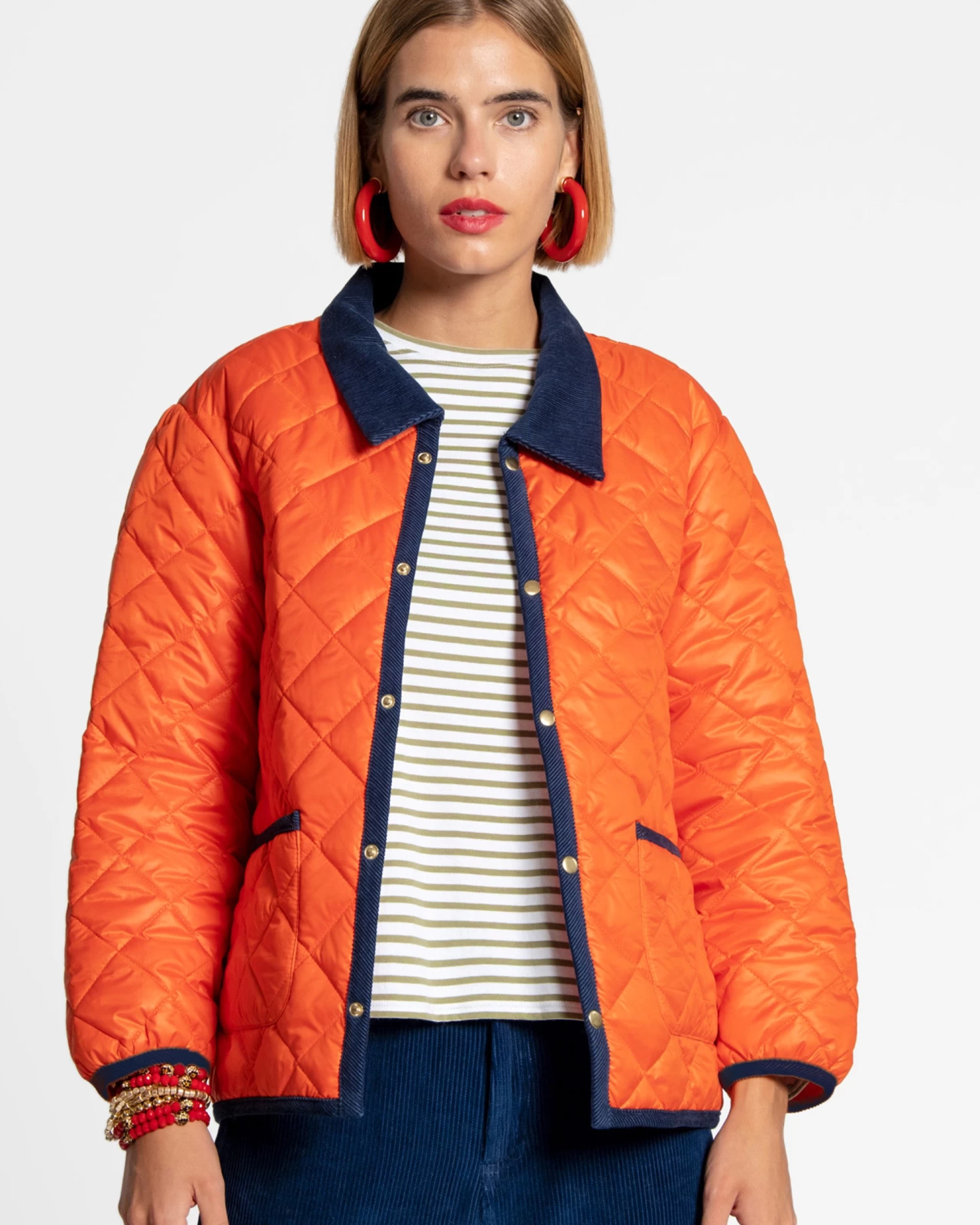 Our Quilted Jacket with corduroy binding and contrast trim is a piece that you will want to wear out to brunch, running errands or headed to Balmoral. Fabricated in lightweight nylon, this jacket is the perfect transitional piece and great for layering.