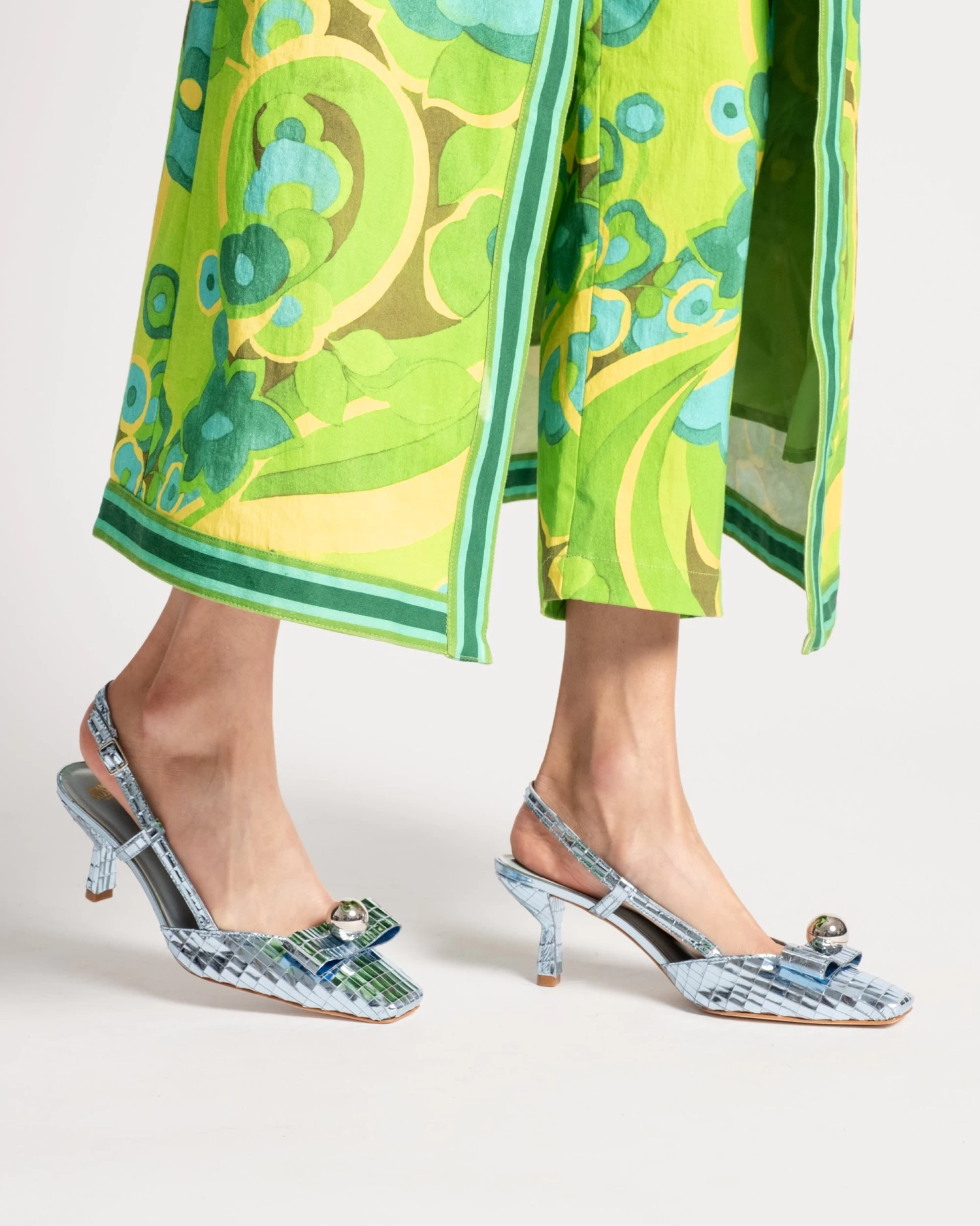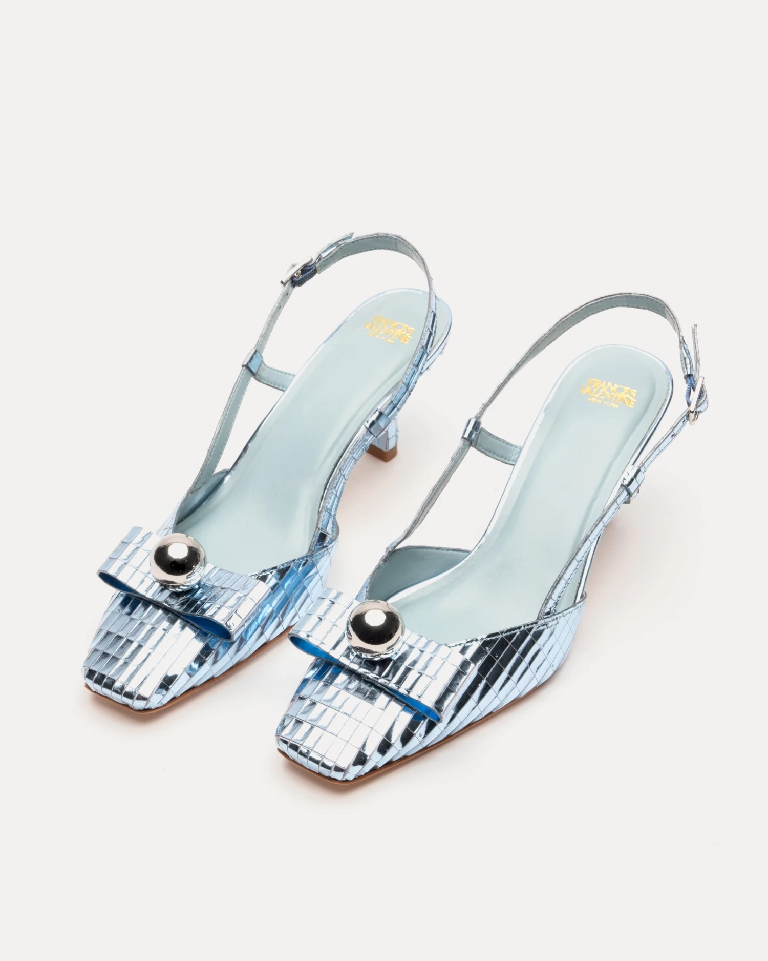 Be the life of the party with our Raquel Disco heels. A classic stiletto silhouette – with a pointed toe and delicate kitten heel – Raquel distinguishes herself with colorful, reflective leather and textured detail designs, topped off by a bold metallic bow. Celebratory and chic, this statement footwear is sure to take the spotlight.