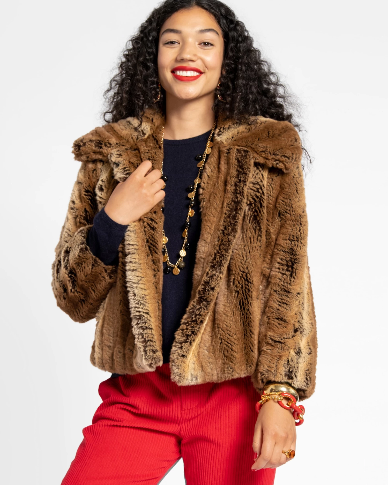 Instantly upgrade your wardrobe with our Short Faux Fur Jacket in chevron stripe print, a jacket that offers luxurious warmth and style. Pair with any of our sweaters, a statement necklace, your favorite cropped denim, and a pair of boots to complete your look.