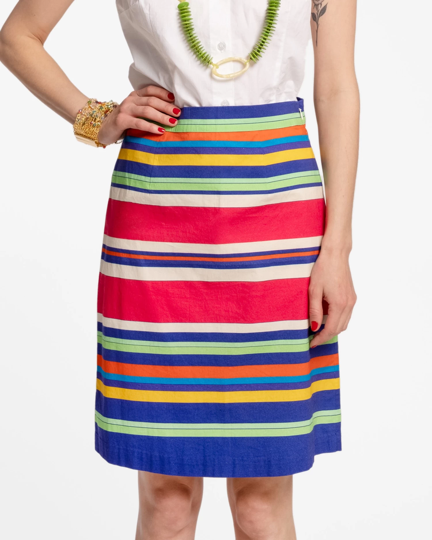 Our Trixie Skirt is a slim stripe skirt featuring bright colors that hits right at the knee making it perfect for both casual and formal events depending upon how you accessorize. Pair with our Scottie Polo for a more relaxed look or dress it up with a statement necklace and our Perfect White Button Down.