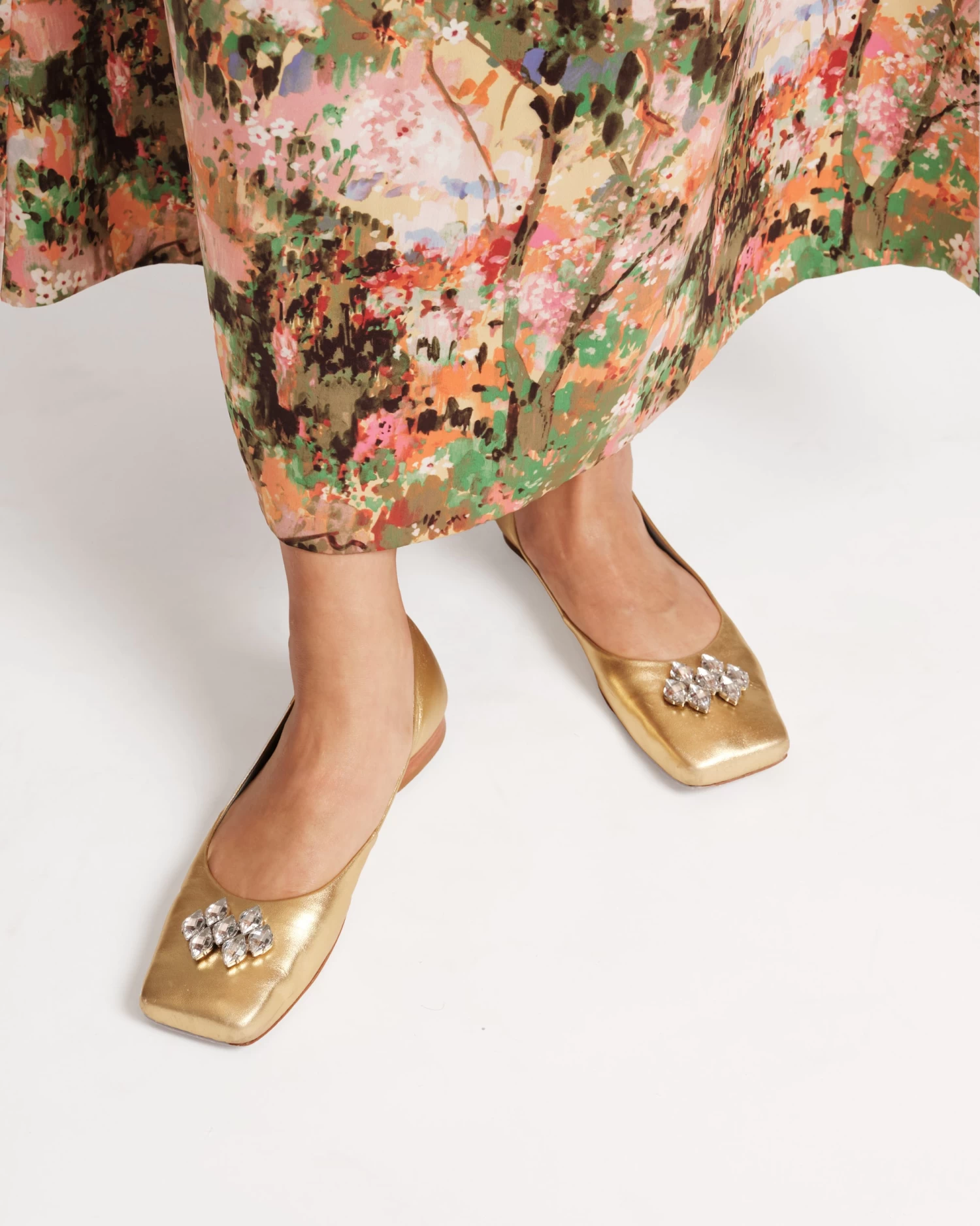 Delicate and elegant, our Square Toe Ballet Flat brings jewel decals and shiny nappa leather to a practical low-top shoe design. Distinct from typical rounded-toe ballet flats, this unique shape elevates your everyday footwear.
