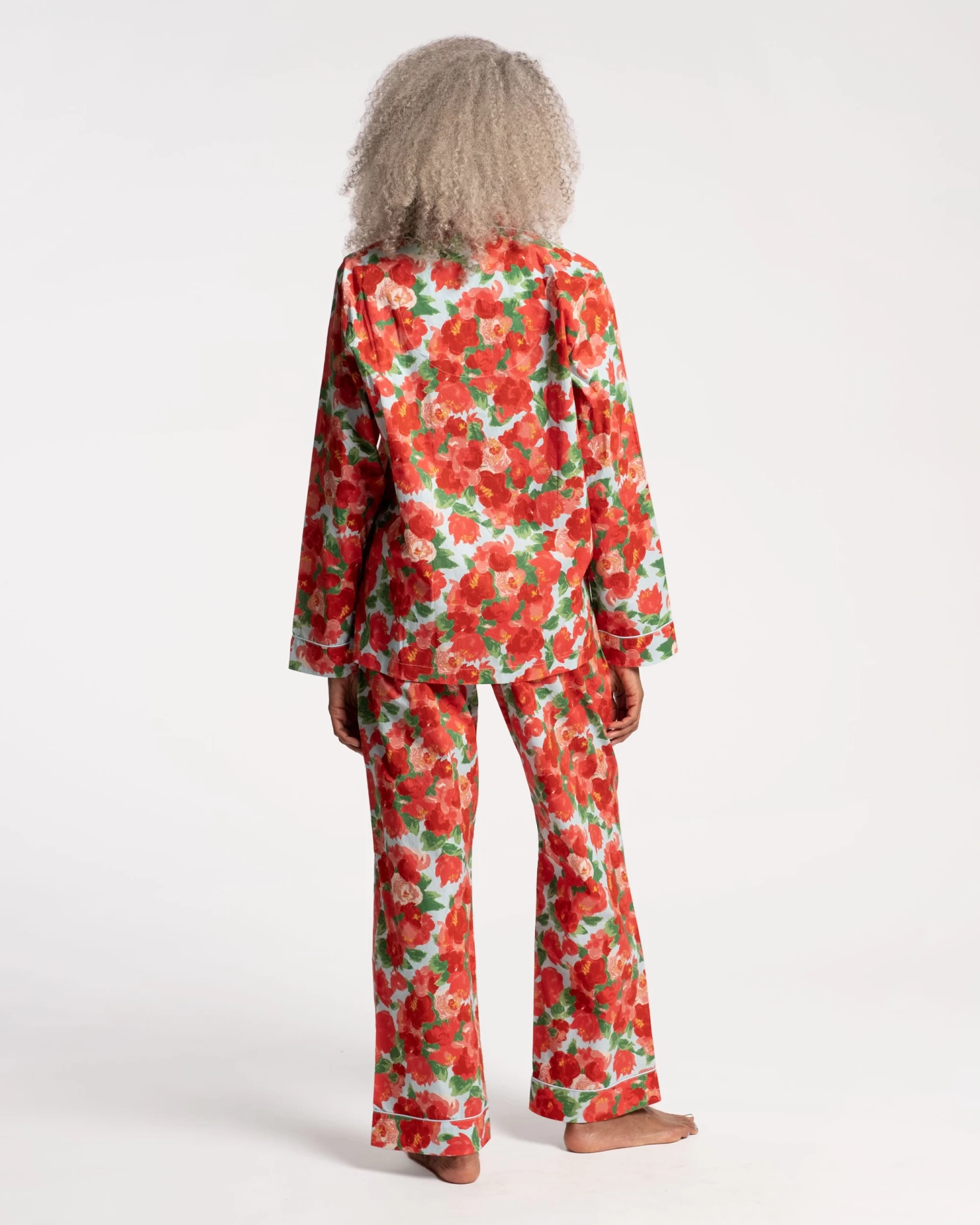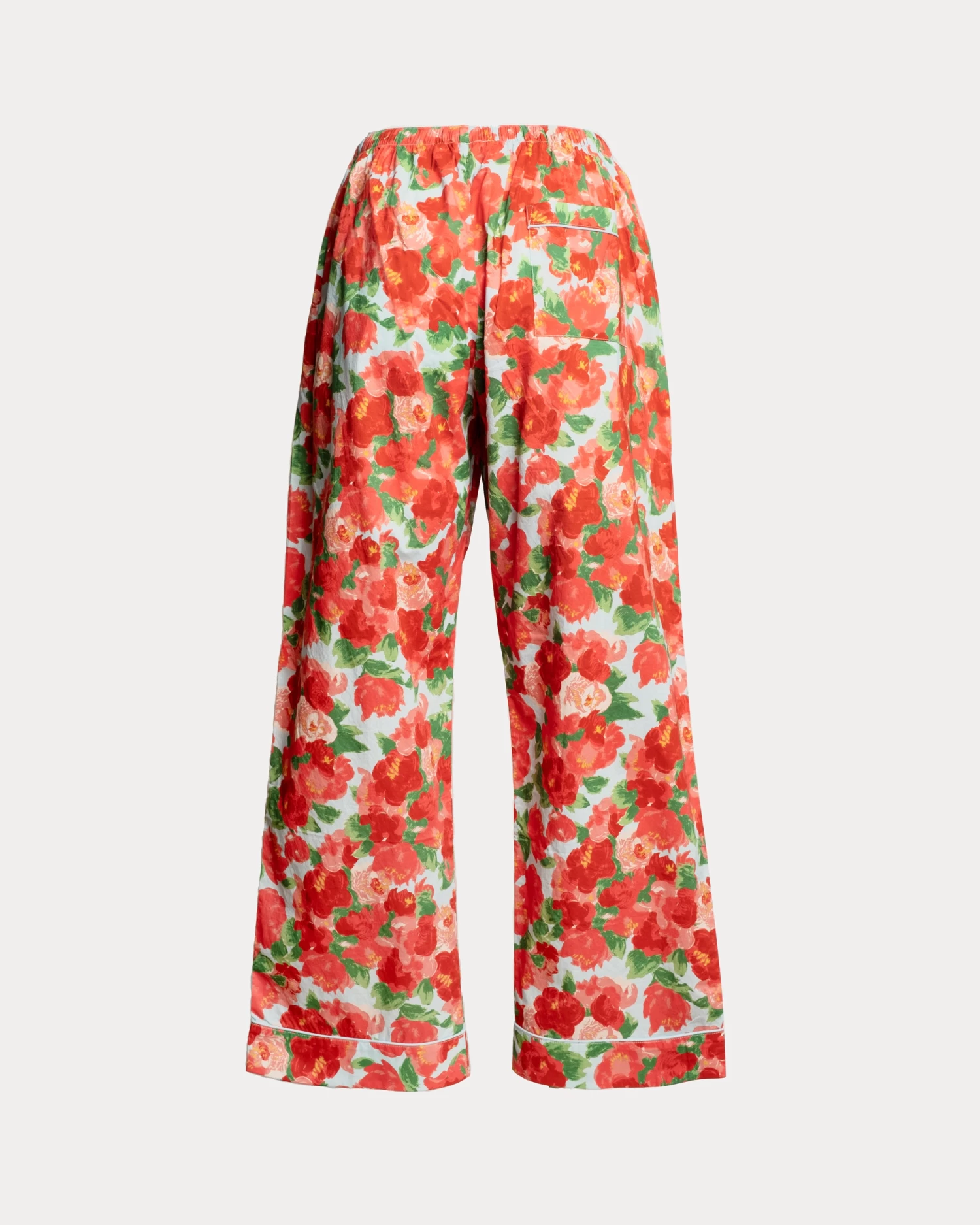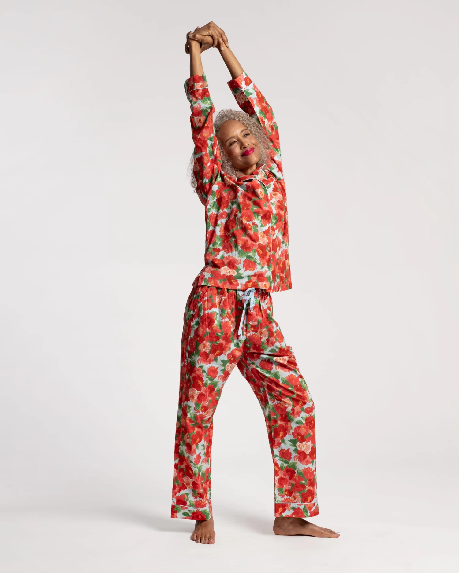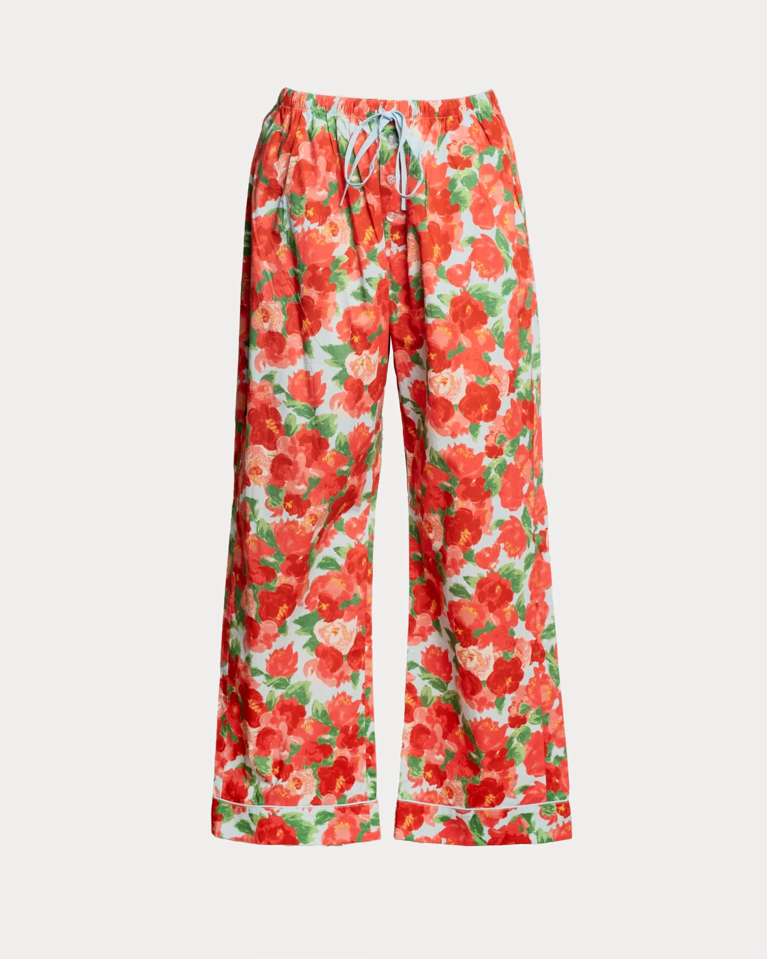 Dress up while you dress down! Our new lightweight poplin Teddy Pajama Pants in our poppy print are both comfortable and chic. These classic style pants are complete with a drawstring waistband and contrast piping detail. These will quickly become your go pajamas!
