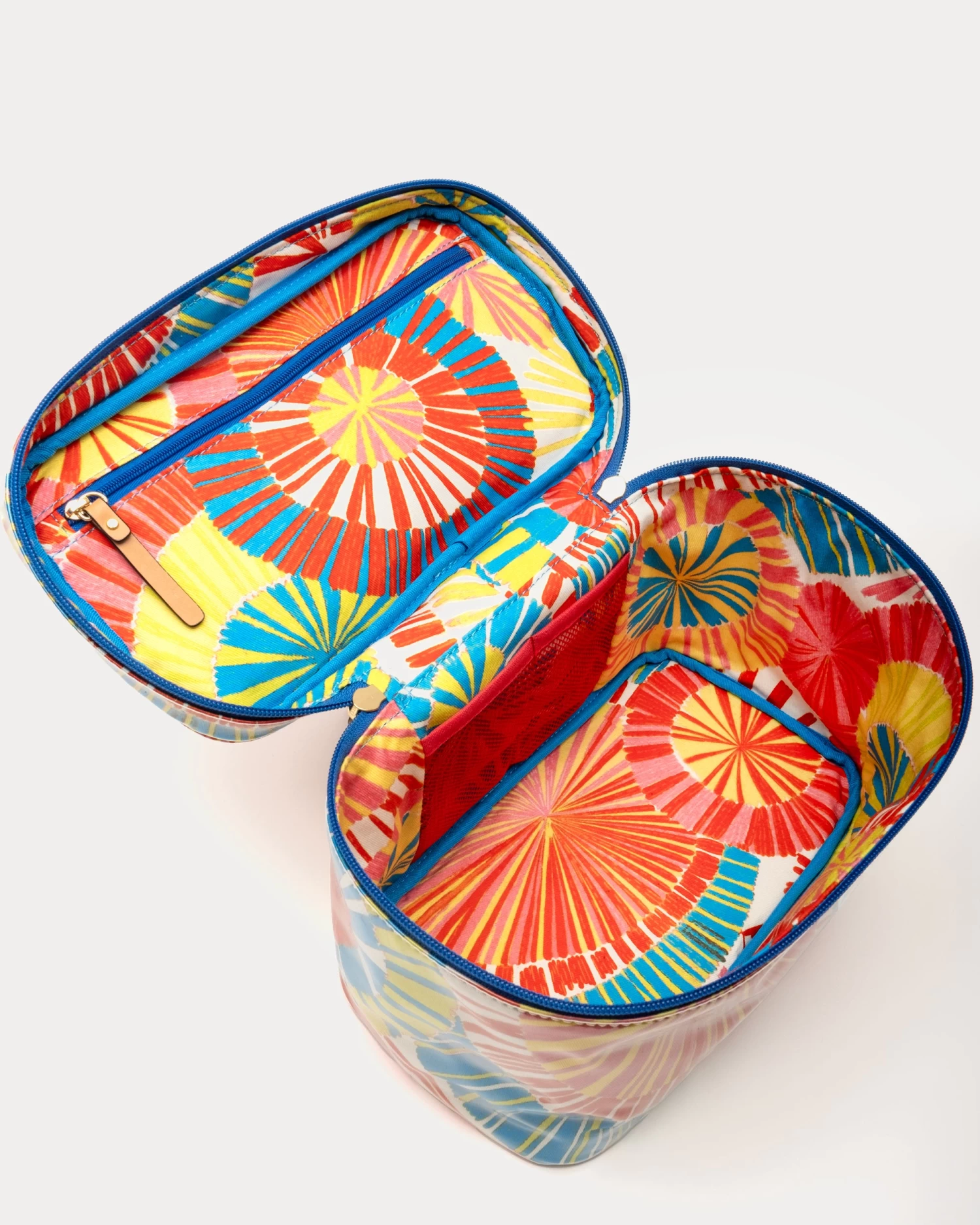 Our Train Case Cosmetic in custom FV Starburst print is the perfect size for travel and or every day use! With an interior zippered pocket and elastic side storage, this cosmetic will be your new go to travel accessory.
