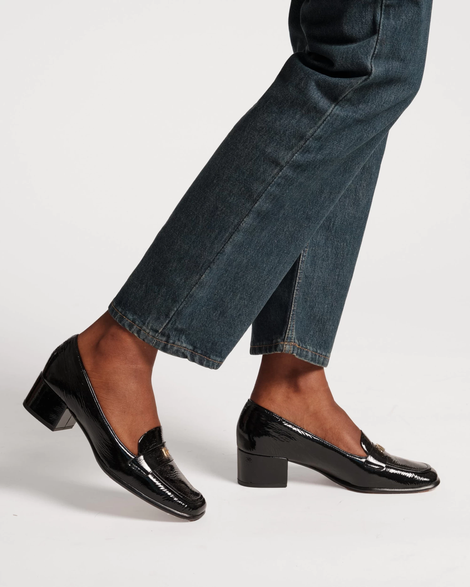An instant classic, our Twiggy Loafer Heel is a colorful leather shoe with a square toe, covered block heel, and gold FV logo-buckle detail. Updated with softer crinkled leather, Twiggy is a comfortable walking heel with endless style.