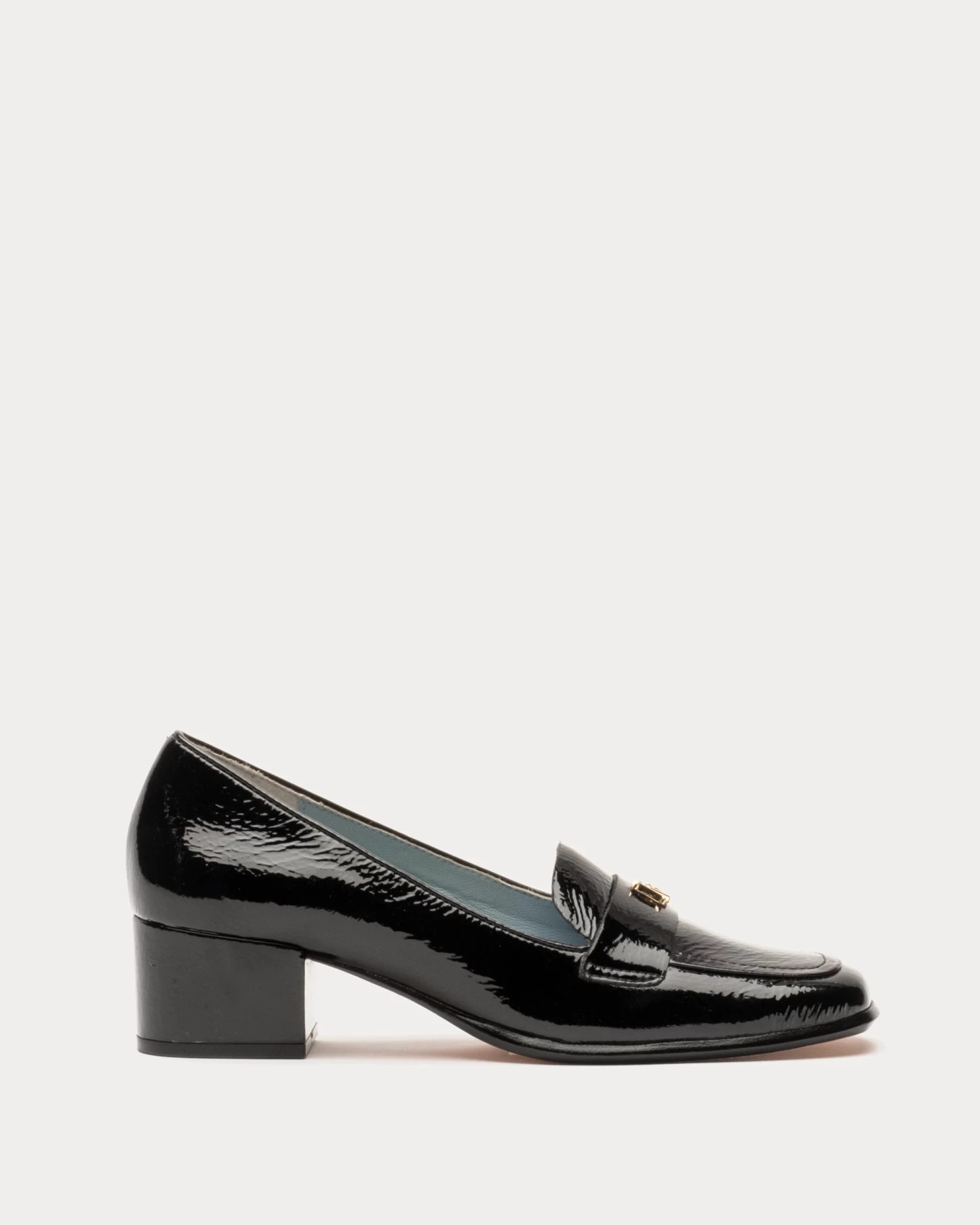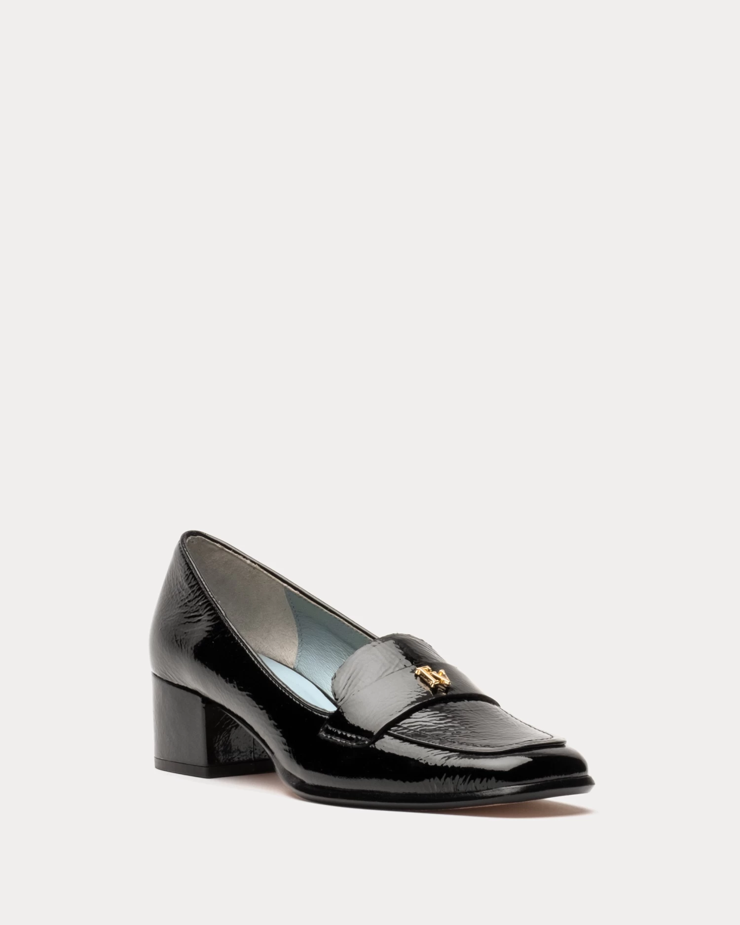 Soft patent leather. Gold FV logo buckle hardware. 2” block heel. Leather sole.