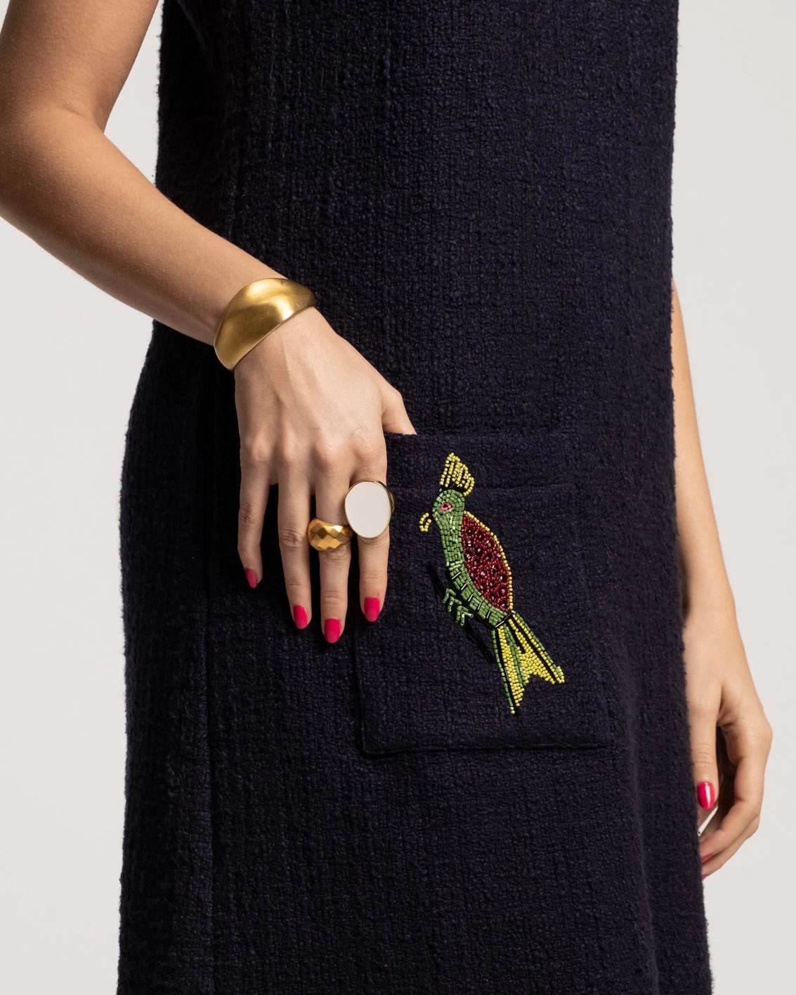 Our Twiggy Fringe Dress is screaming for a cocktail. This just above the knee silhouette features a brightly hand beaded embroidered bird on the front pocket. We love this fun and colorful detail! Pair with any of our heels and some jewelry for a perfect look.