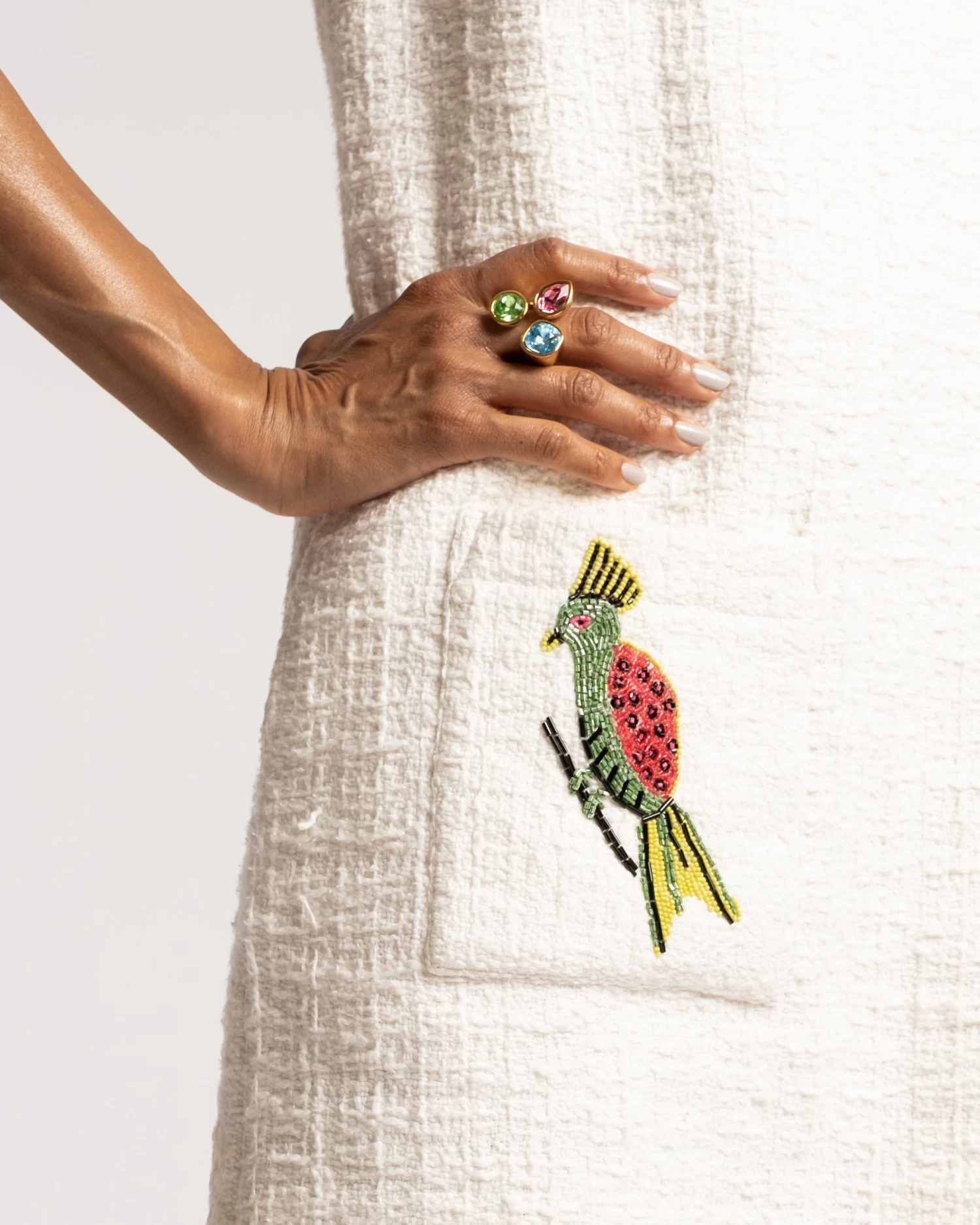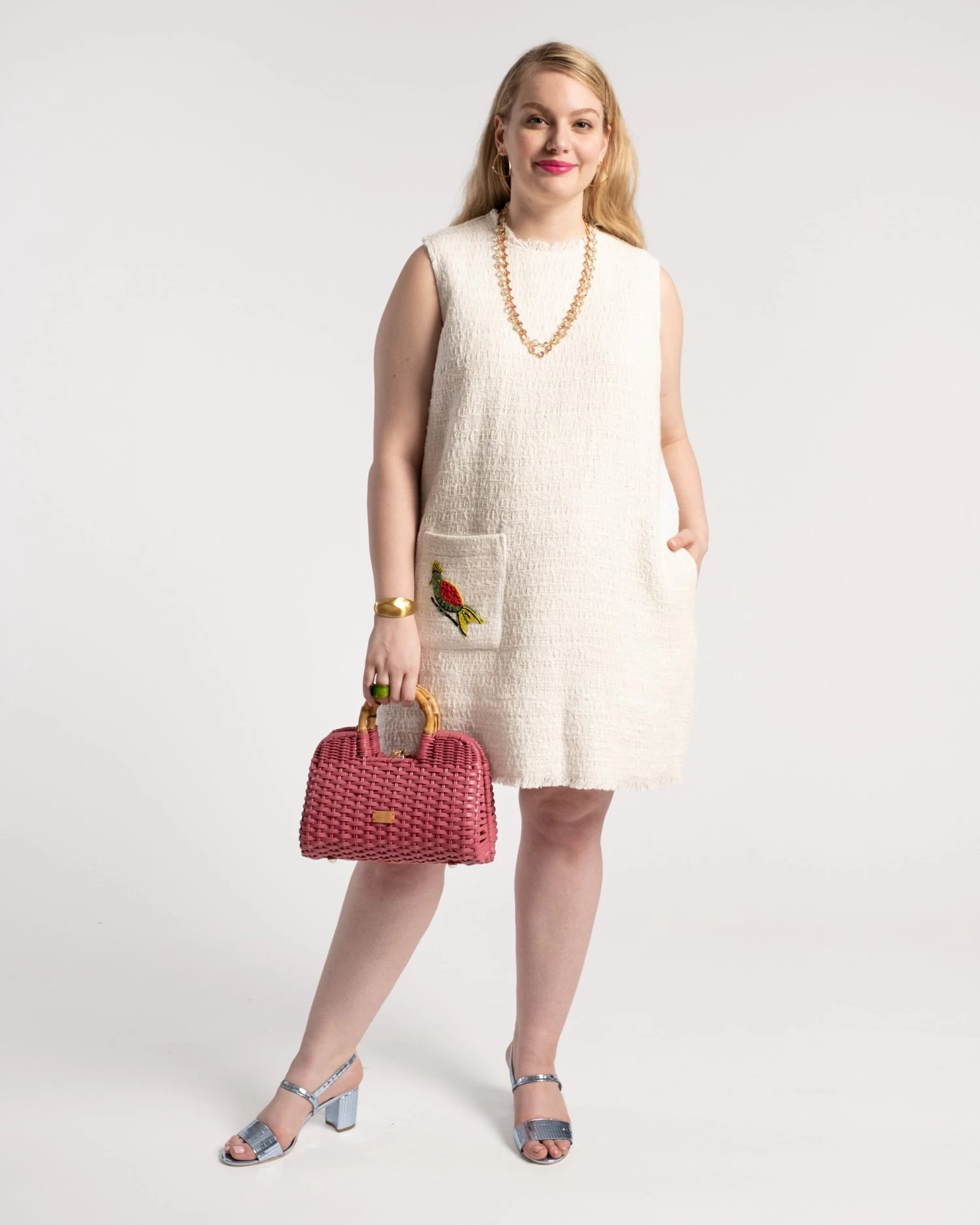 Our Twiggy Fringe Dress is screaming for a cocktail. This just above the knee silhouette features a brightly hand beaded embroidered bird on the front pocket. We love this fun and colorful detail! Pair with any of our heels and some jewelry for a perfect look.