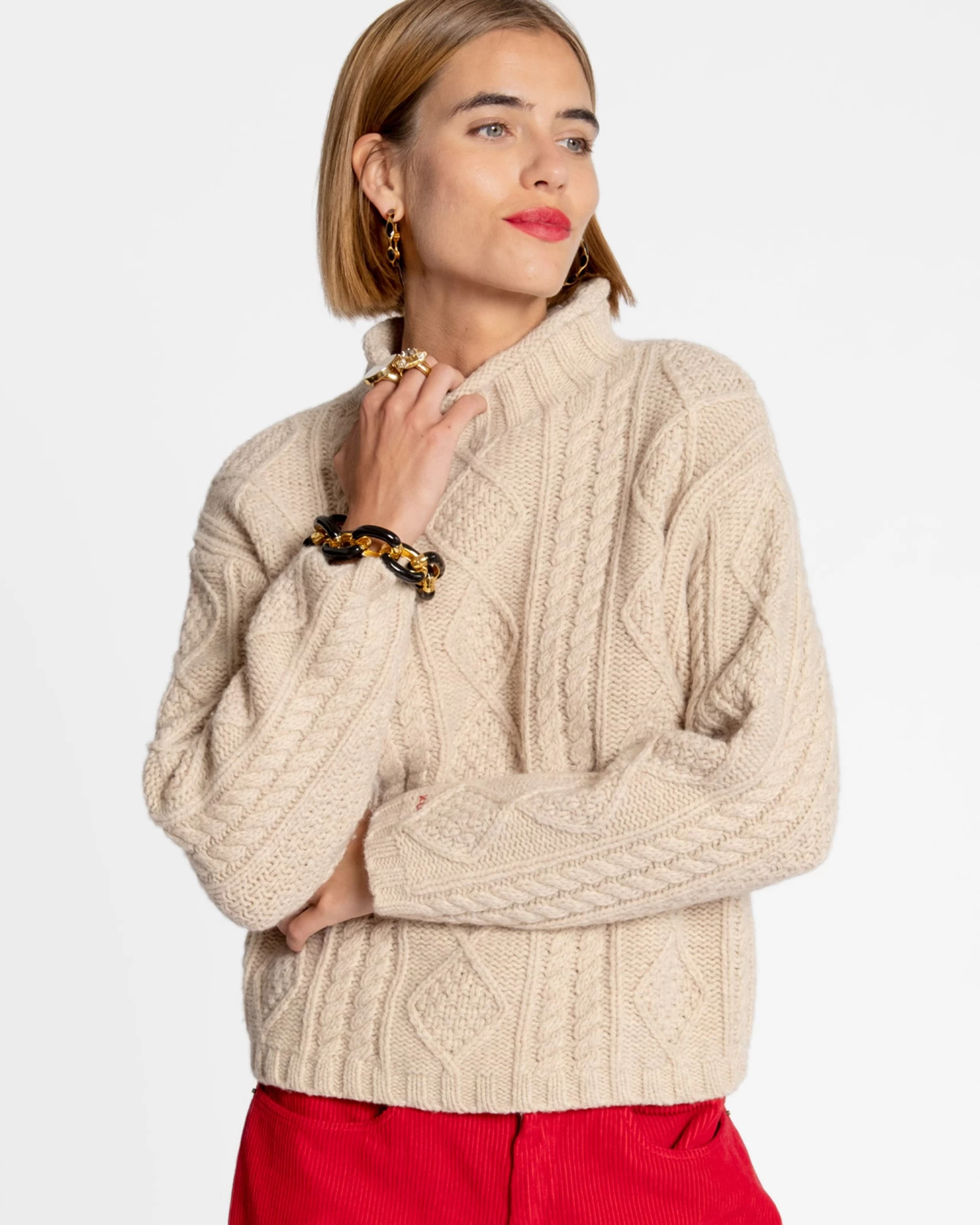 Introducing the Wool Fisherman Skipper Pullover, a classic “Aran” style cable pullover with roll edge collar and drop sleeves. This effortless classic can be worn anywhere and easily styled with your favorite pieces.